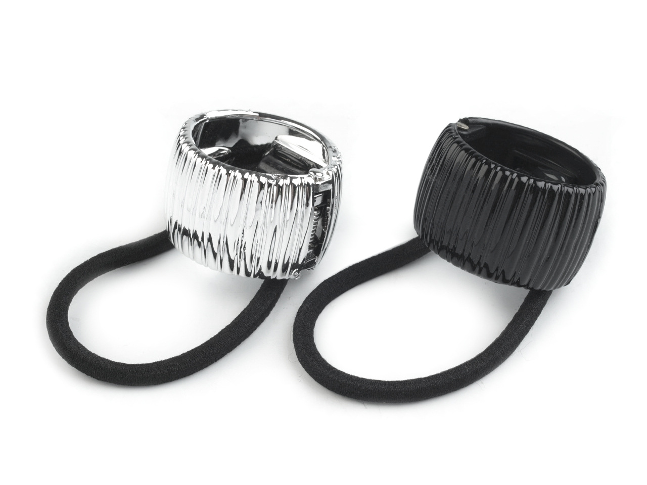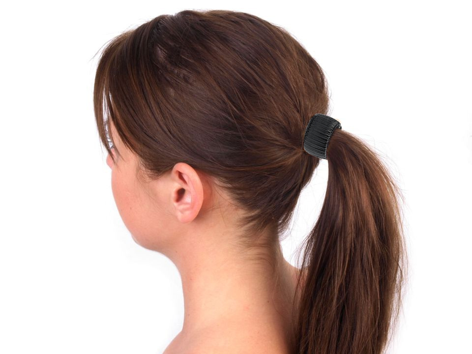 S gumičkou se sponou povýšíte jednoduchý cop na extra třídu s minimálním úsilím. Uvnitř spony je připevněná pevná, pružná gumička. Spona se dá rozevřít a přicvaknout kolem copu. Její povrch je vroubkovaný, věrně napodobuje kov.