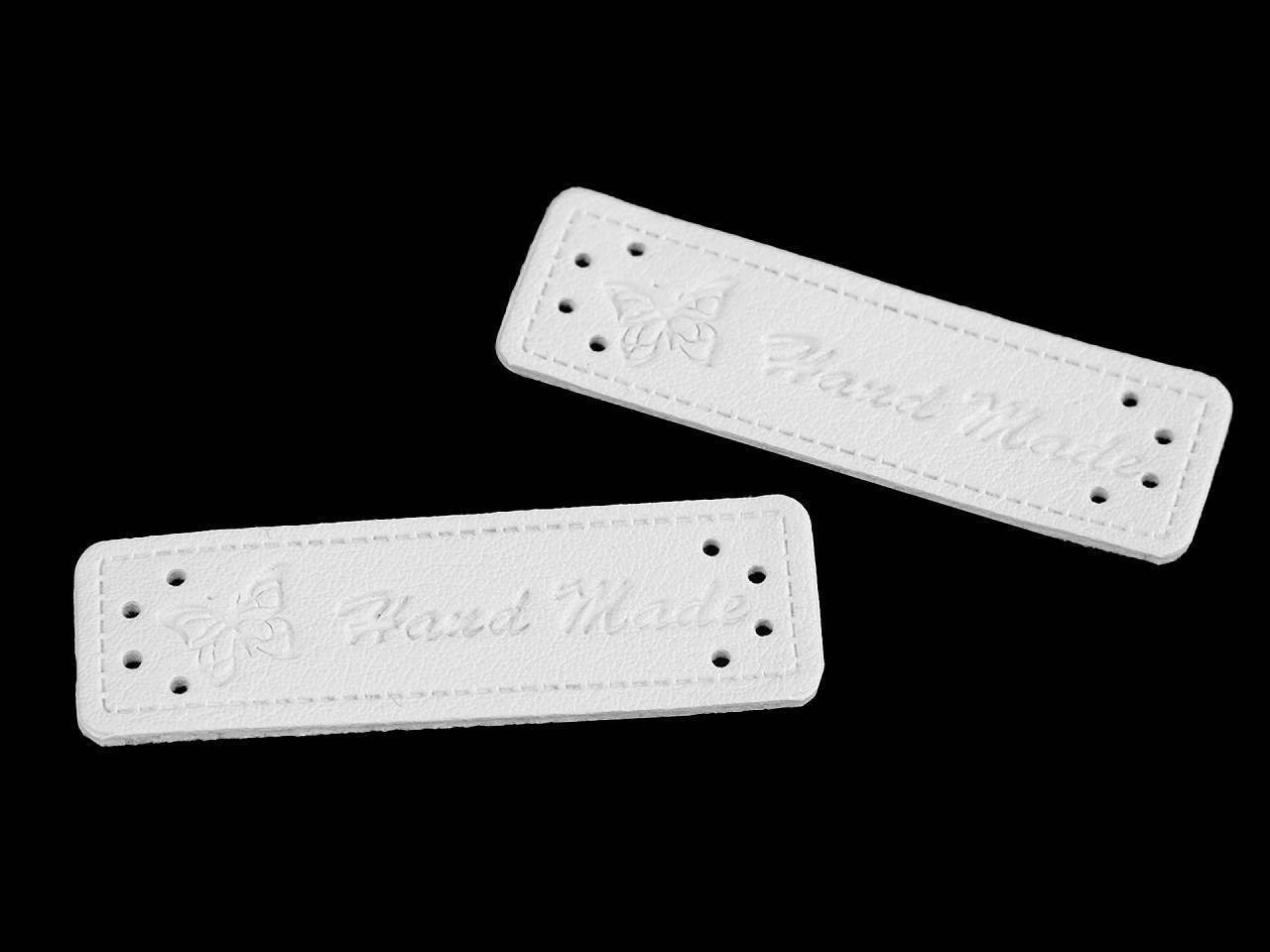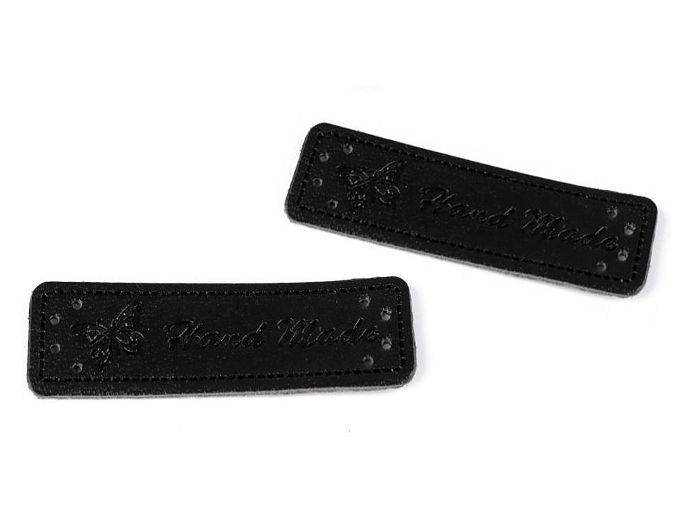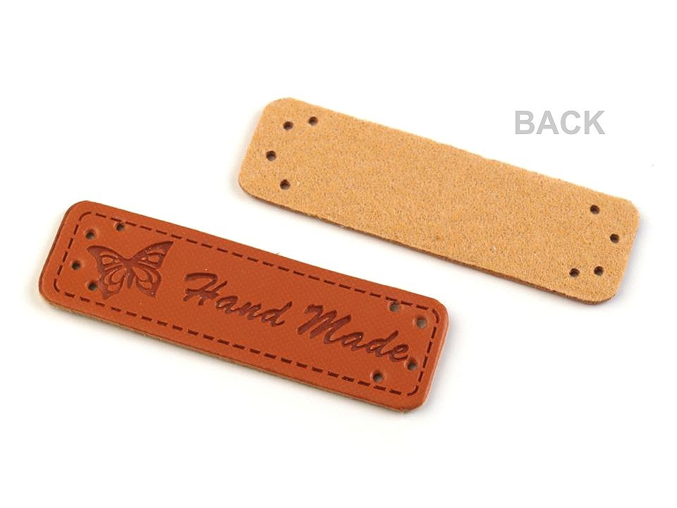 Cedulku z eko kůže oválného tvaru zdobí jednostranný nápis "hand made". Zaujme vás předseknutými otvory, které slouží jako dekorace. Po stranách cedulky jsou dírky, díky kterým ji lze přišít nebo jimi provléct šňůrku.