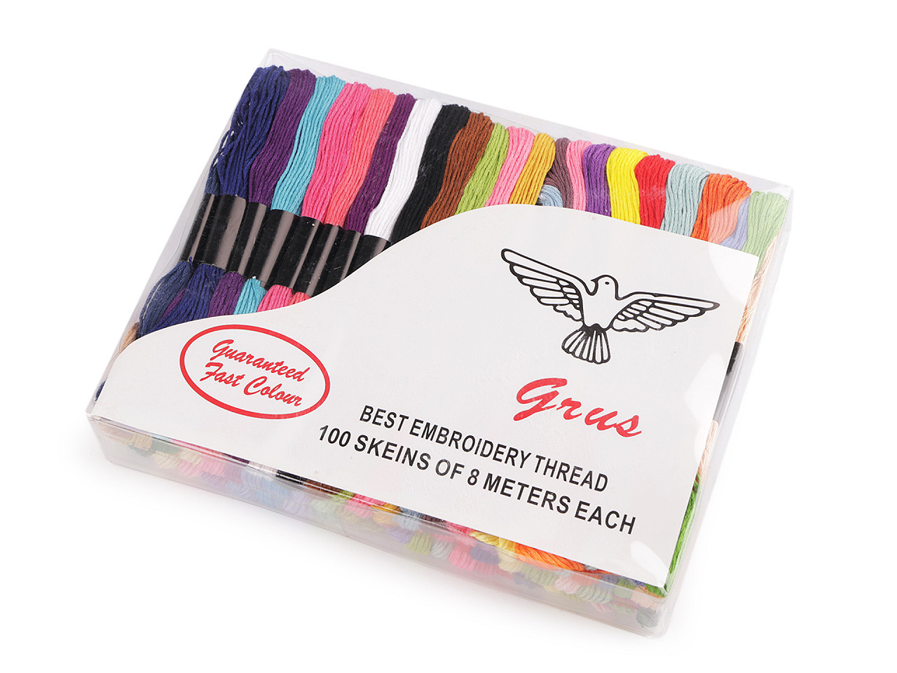 Vyšívací příze pro každé šikovné ručičky, nejen pro profesionální vyšívačky. Příze je k dostání v mnoha různých barvách, v balení dostanete 100 ks různých barev (cca 20 odstínů). Jednotlivá balení se však mohou složením barev lišit. Jedna vyšívací příze má 8 m.