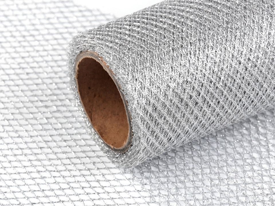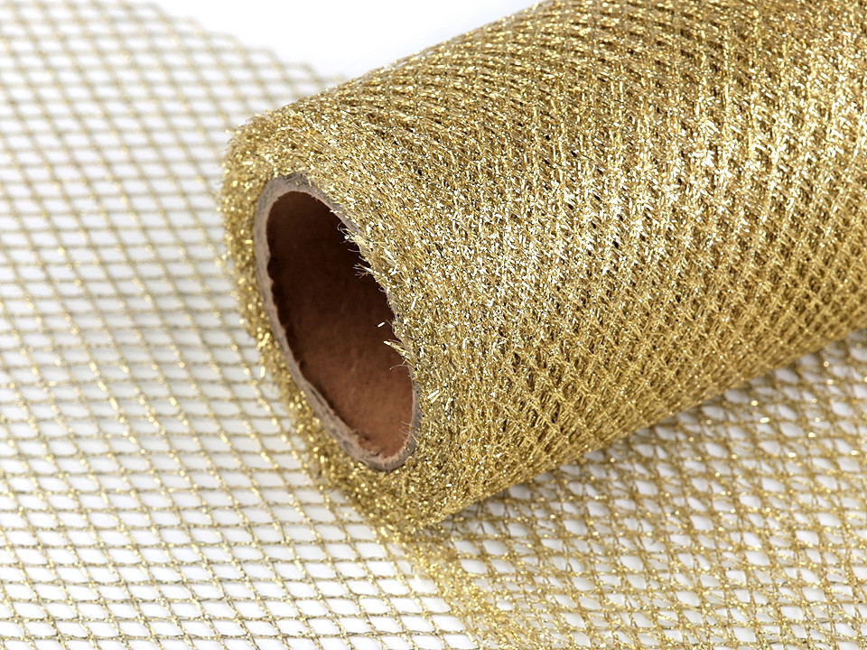 Dekorační stuha je protkaná třpytivým lurexem. Díky větším očkám 3 x 3 mm působí jako síťka.