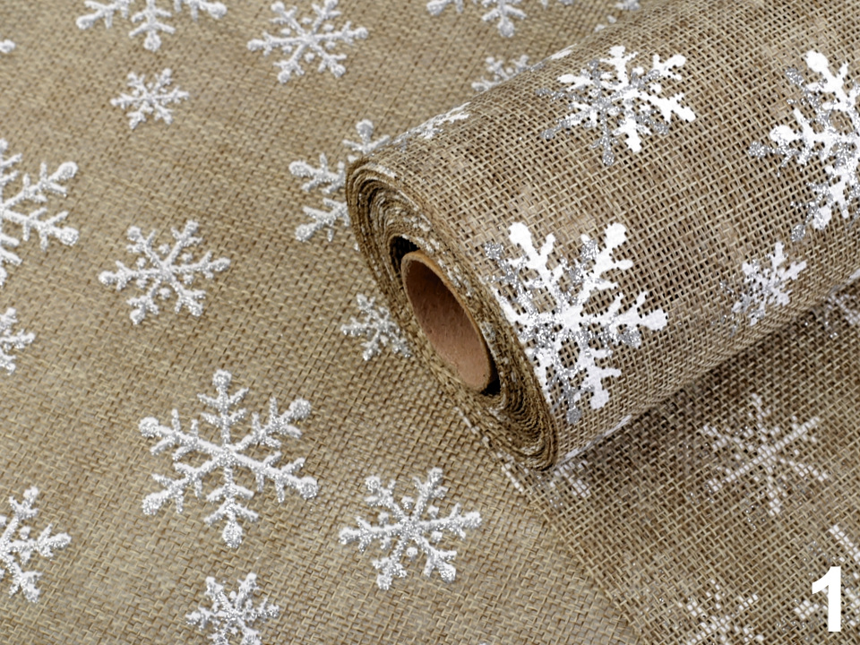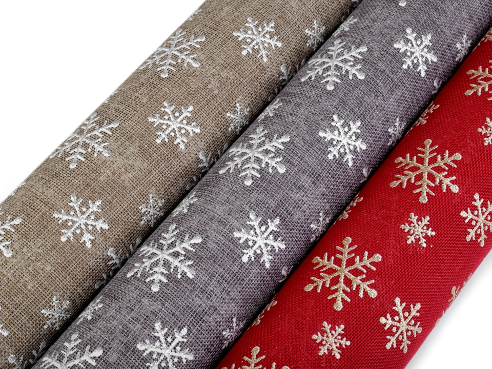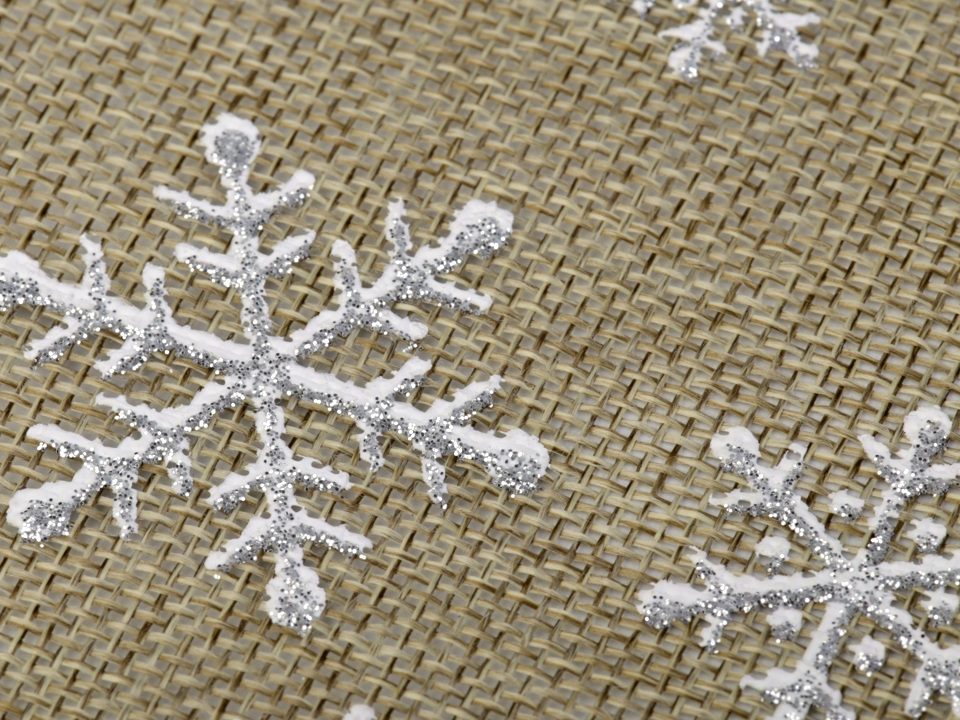 Dekorační metráž s vločkami se díky glitrům krásně třpytí. Je ideální na zimní a vánoční aranžování. Potisk je jednostranný.