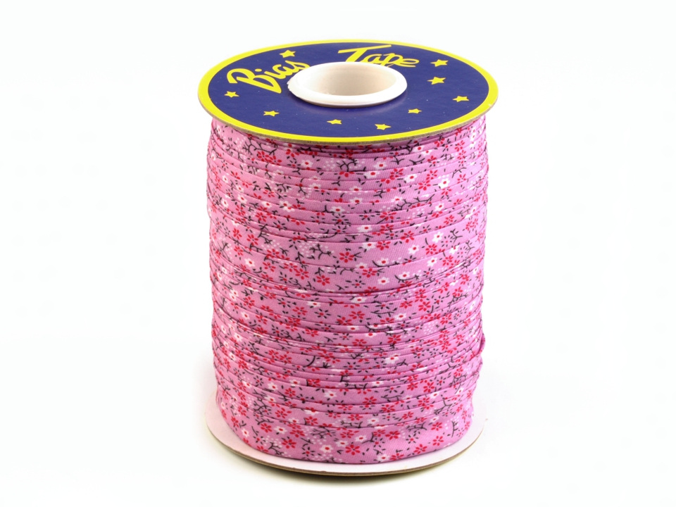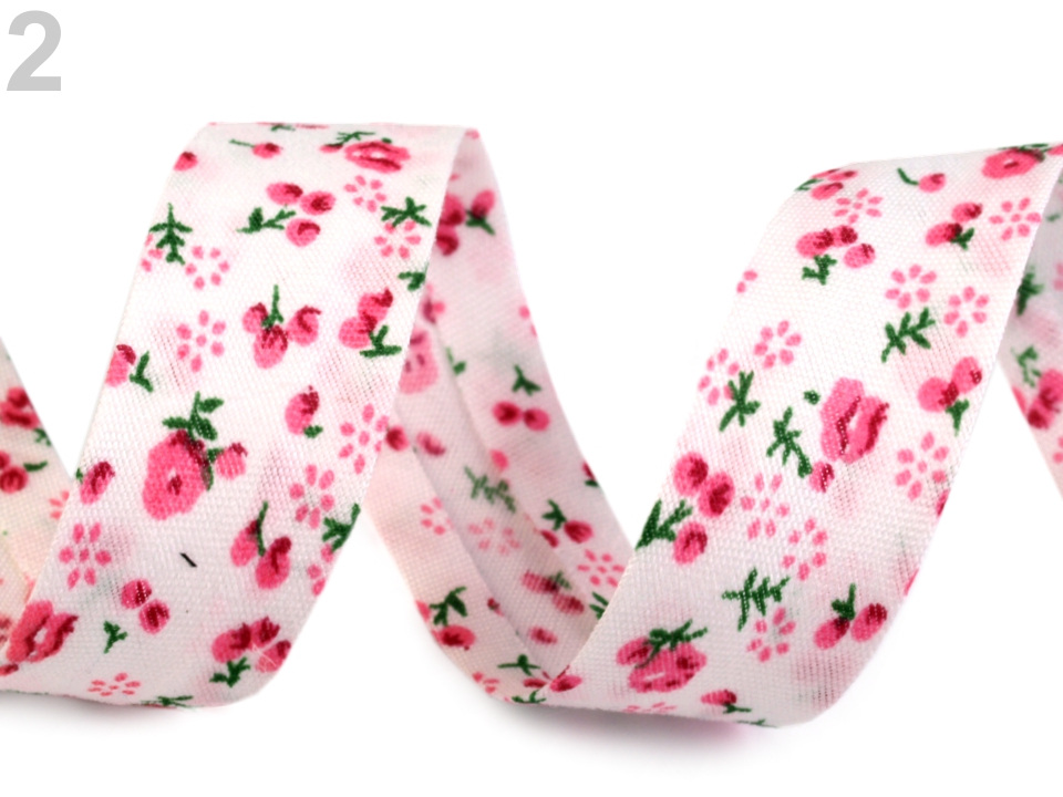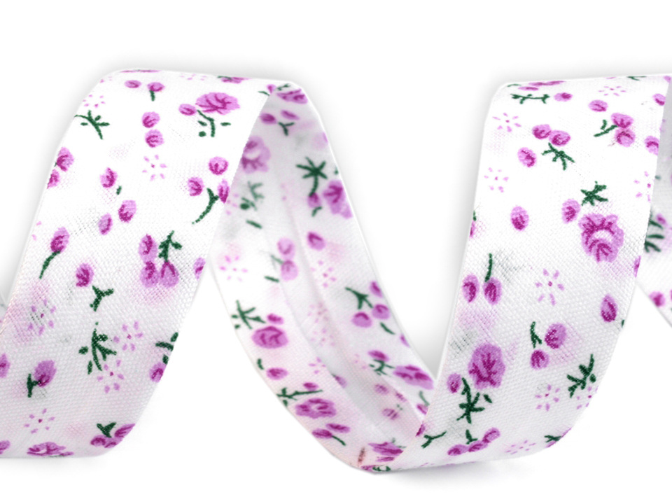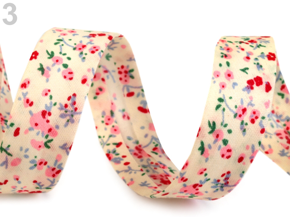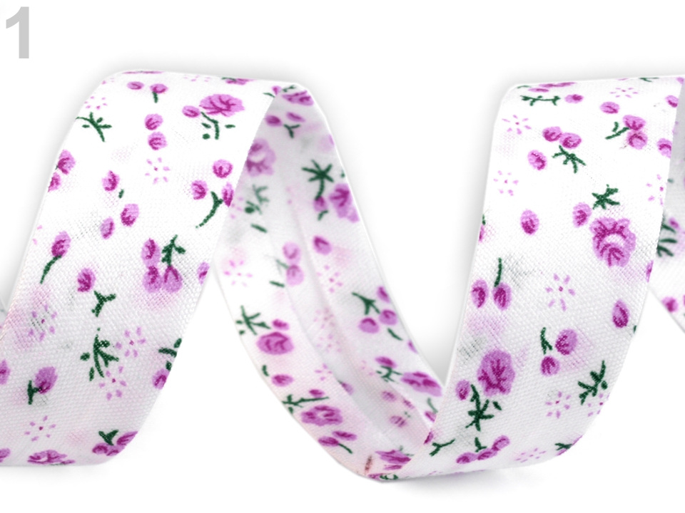 Šikmý proužek s motivy jemných květů je pevný a zažehlený. Po našití má poloviční šíři tzn., že tento proužek bude mít po našití šíři 10 mm.