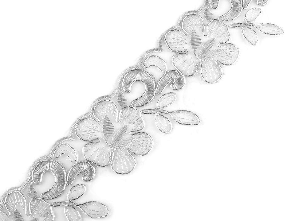 Prýmek na monofilu zdobí květinová výšivka s lurexem. Celý prýmek připomíná sutaškovou výšivku.