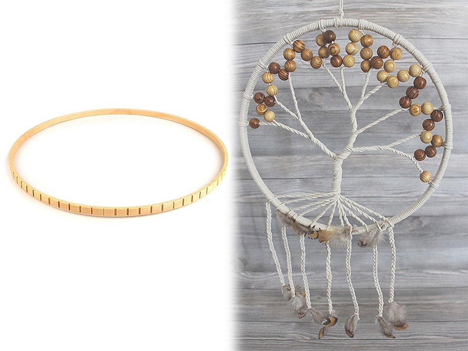 Dřevěný kruh s drážkami z bukového dřeva využijete na výrobu lapačů snů, zvonkoher a podobných dekorací. Je vhodný také na drhané obrázky a závěsy.