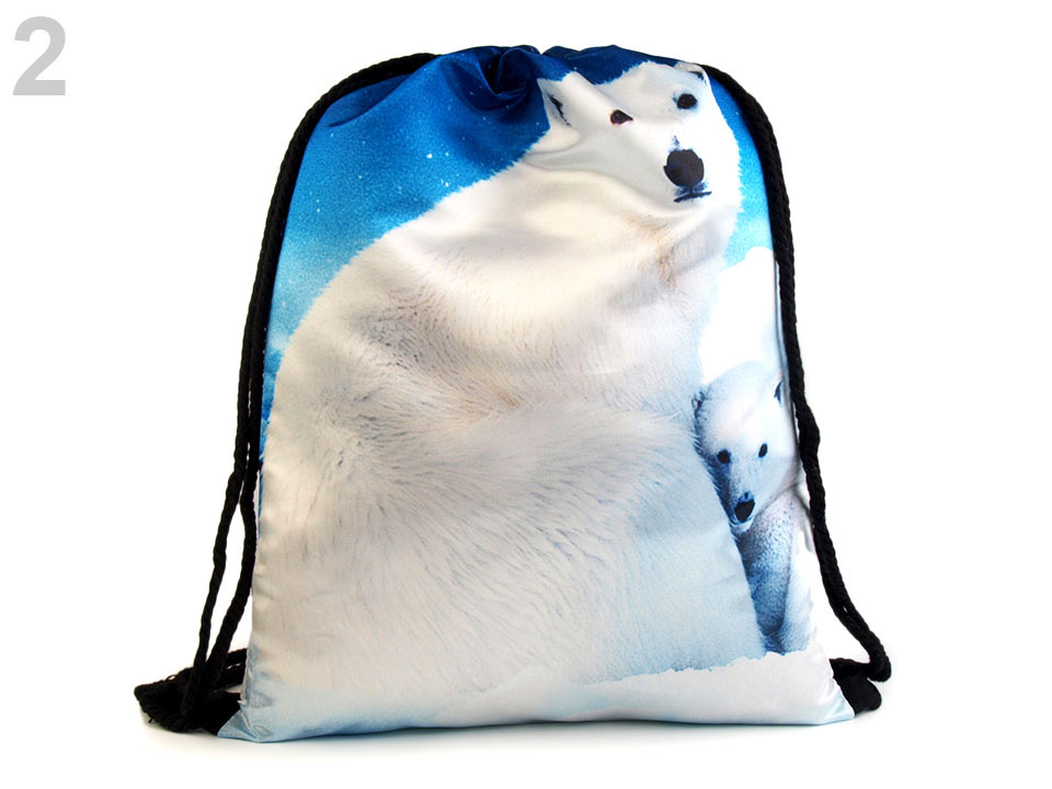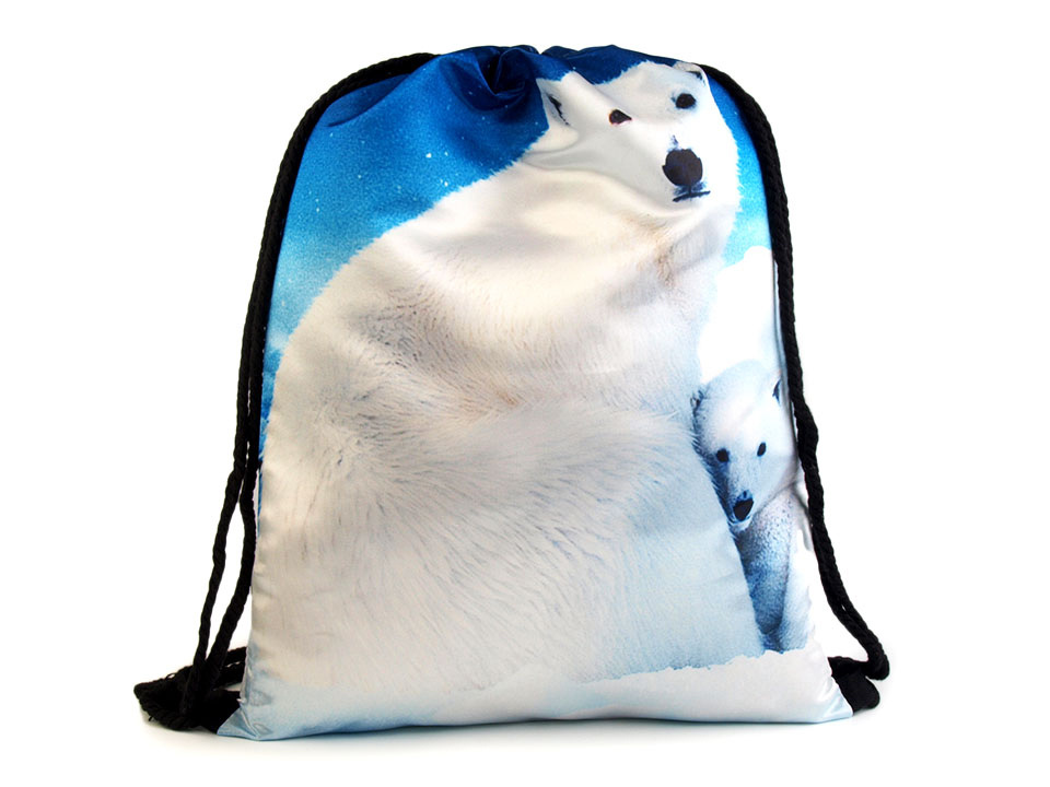 Vak na záda s potiskem zaujme všechny milovníky zvířat. Díky lesklému saténu vypadá luxusně. Stahuje se jednoduše pomocí kroucených šňůrek. Potisk je oboustranný. Do vaku můžete schovat boty, přezůvky i oblečení. Využijí ho nejen sportovci, ale také děti do školy.