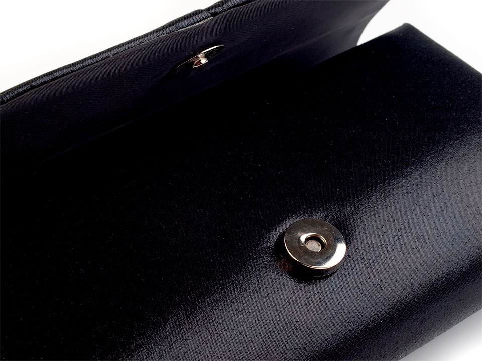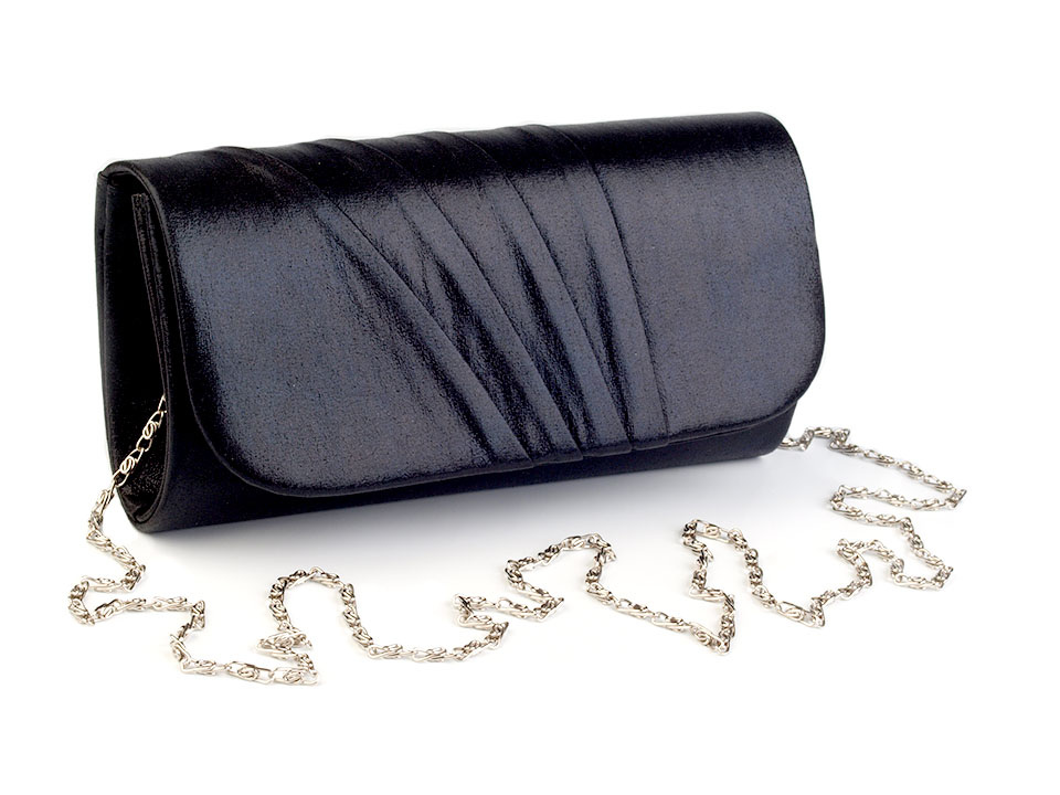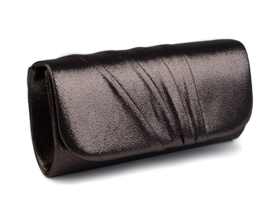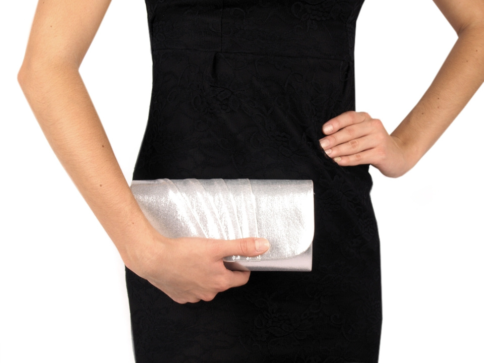 Metalické psaníčko má na přední straně decentně nařasenou látku, která vytváří zajímavý design. Psaníčko je vyztužené, uvnitř má polyesterovou podšívku a malou kapsičku na drobnosti. Zapíná se na magnet. K psaníčku patří odepínatelný řetízek - můžete nosit s řetízkem přes rameno nebo bez něj jen tak v ruce.