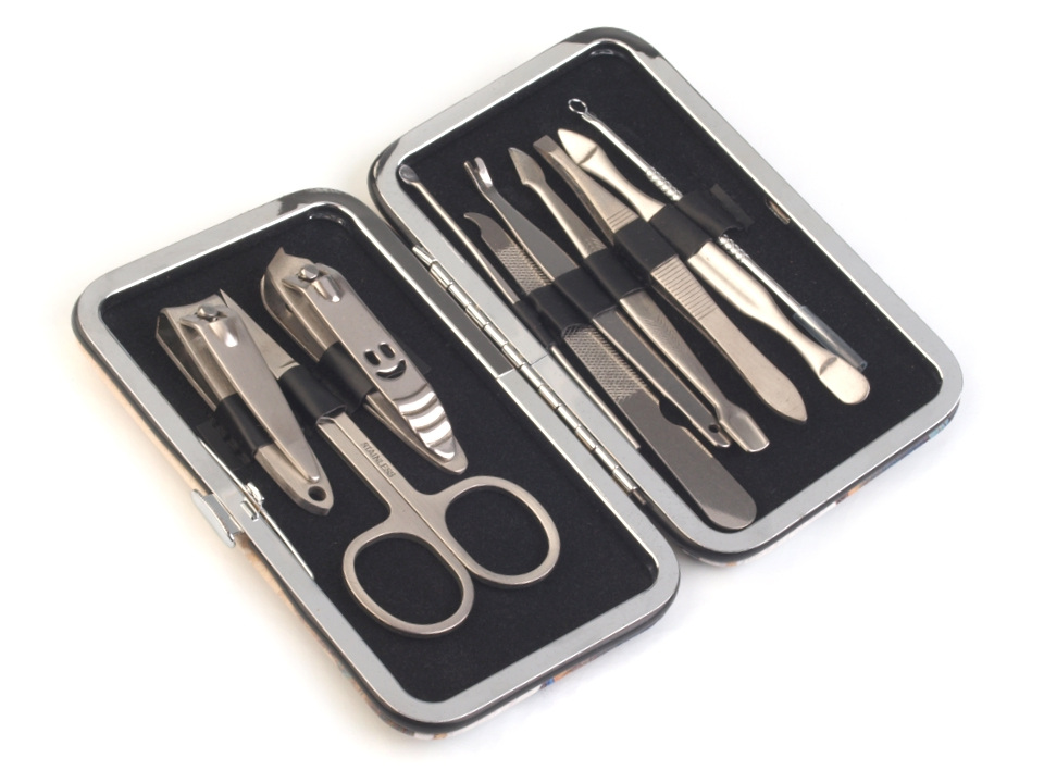 Manikúra obsahuje: nehtové nůžky, pilník, pinzetu, nástroje na zatlačení nehtové kůžičky a 2 kusy nehtových kleští.