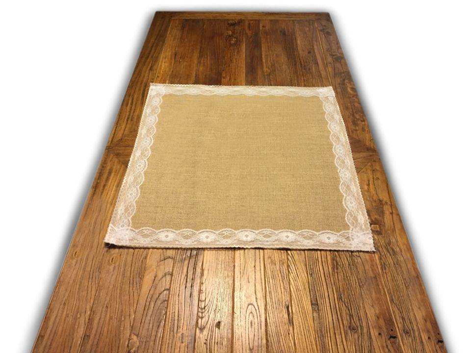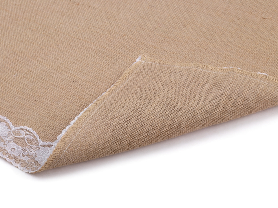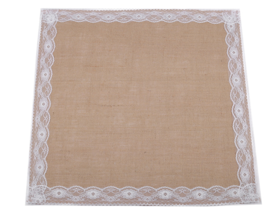 Jutový ubrus je na okrajích zdobený jemnou krajkou s květy.
