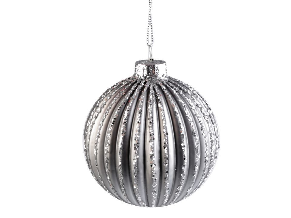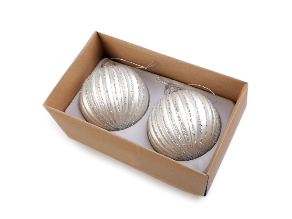 Baňky s mřížkovaným designem doplňují třpytivé glitry. Mají poutko z lurexu na zavěšení.