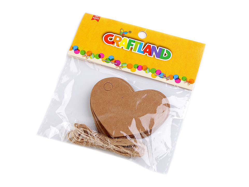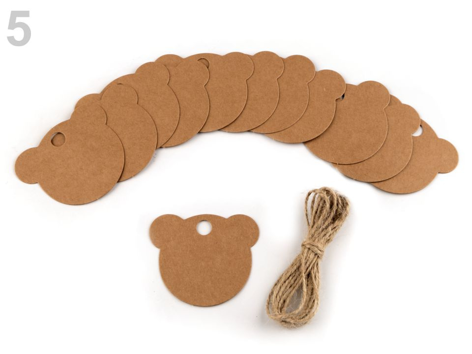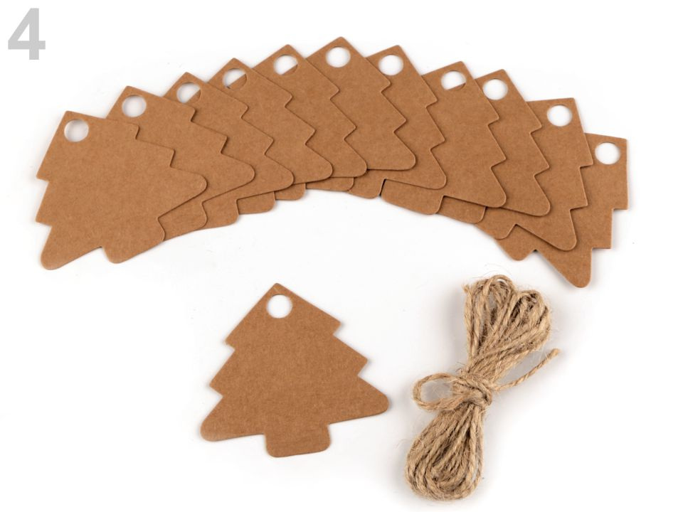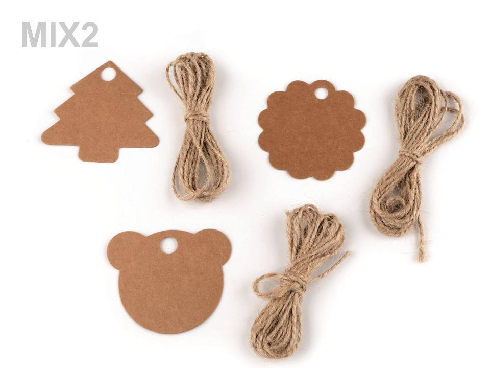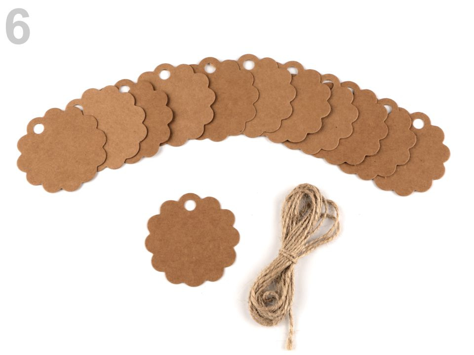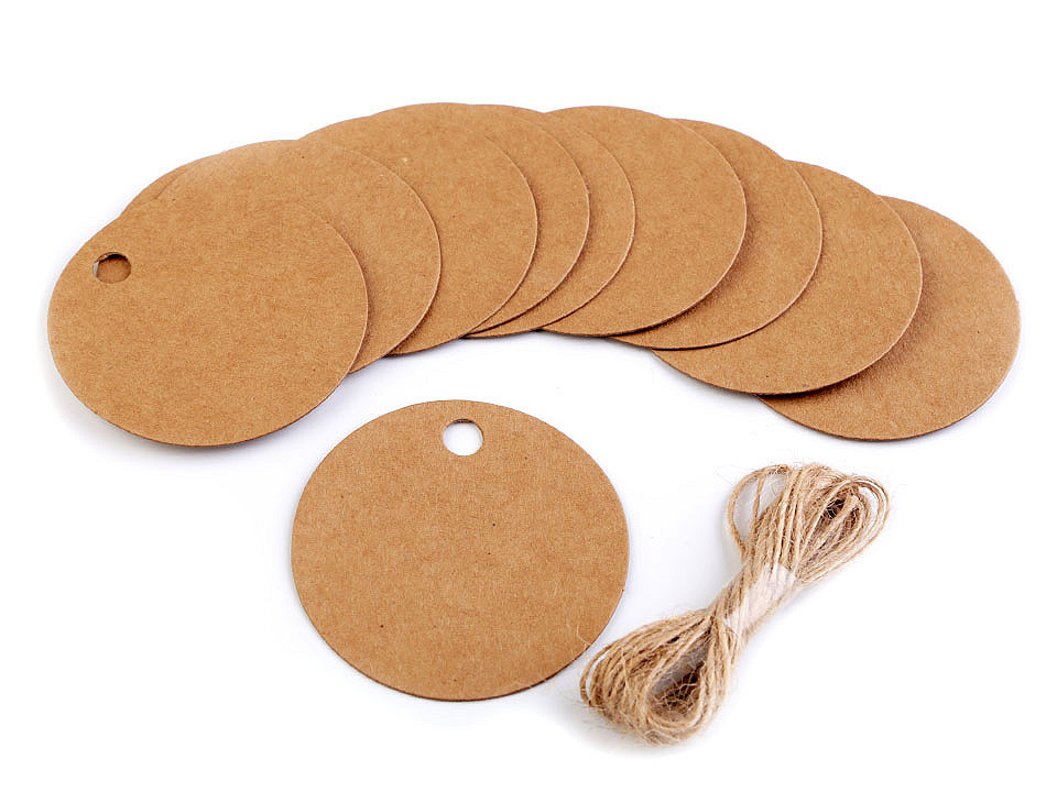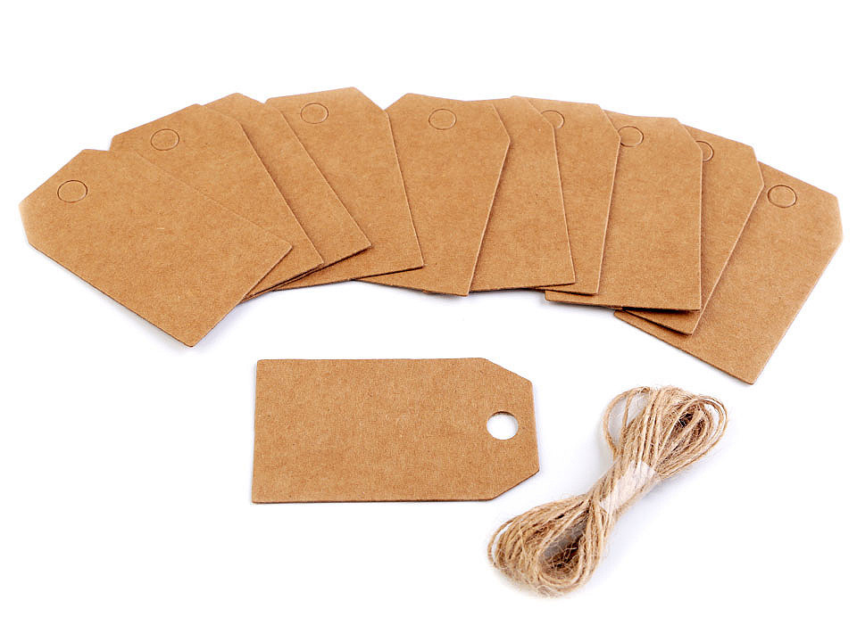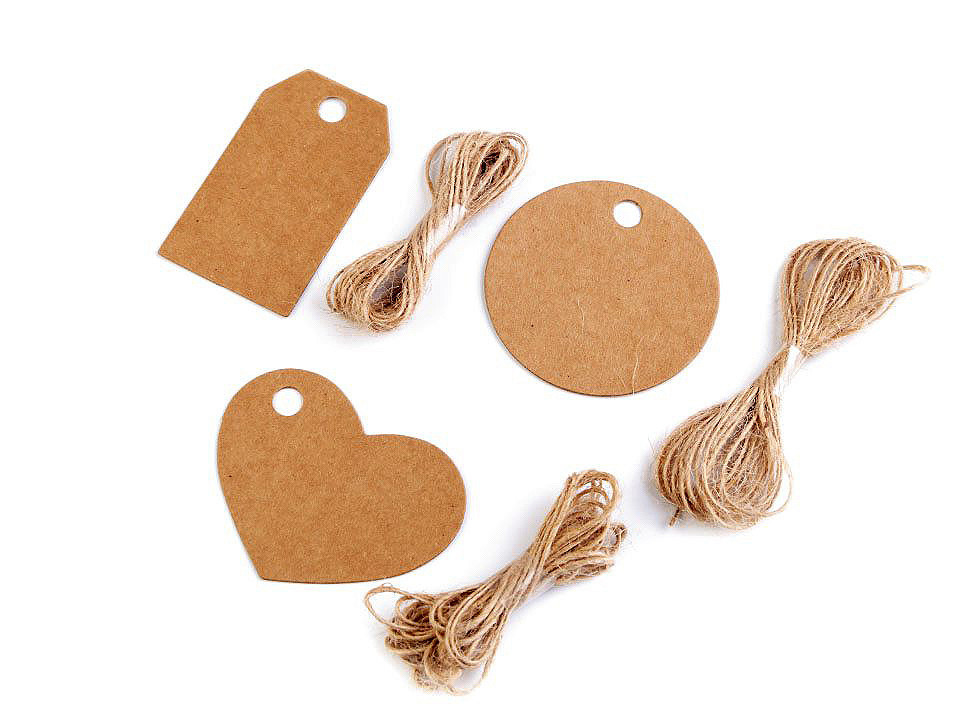 Je vyrobená z pevného papíru. V horní části má vyražený kruhový otvor. Součástí balení je šňůrka na přivázání.