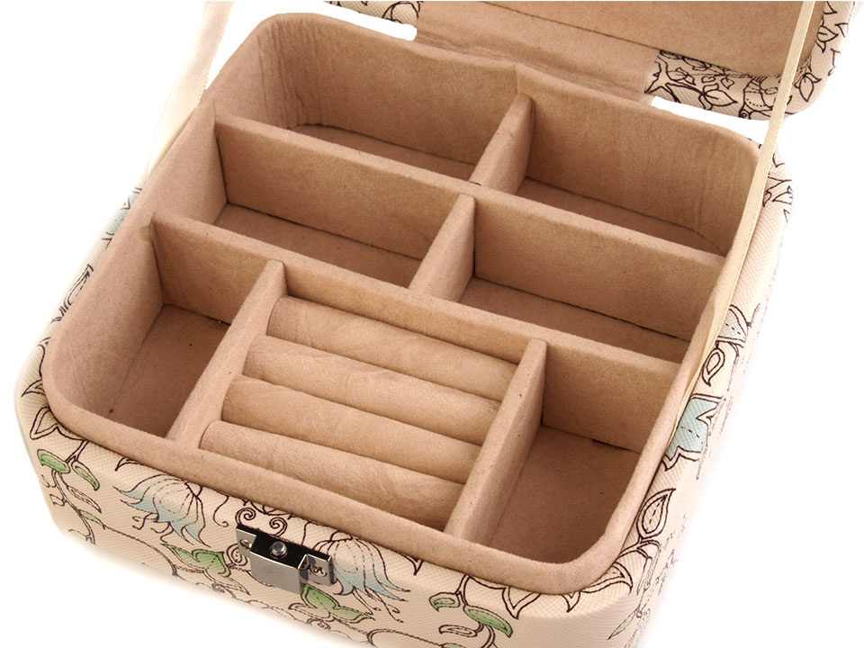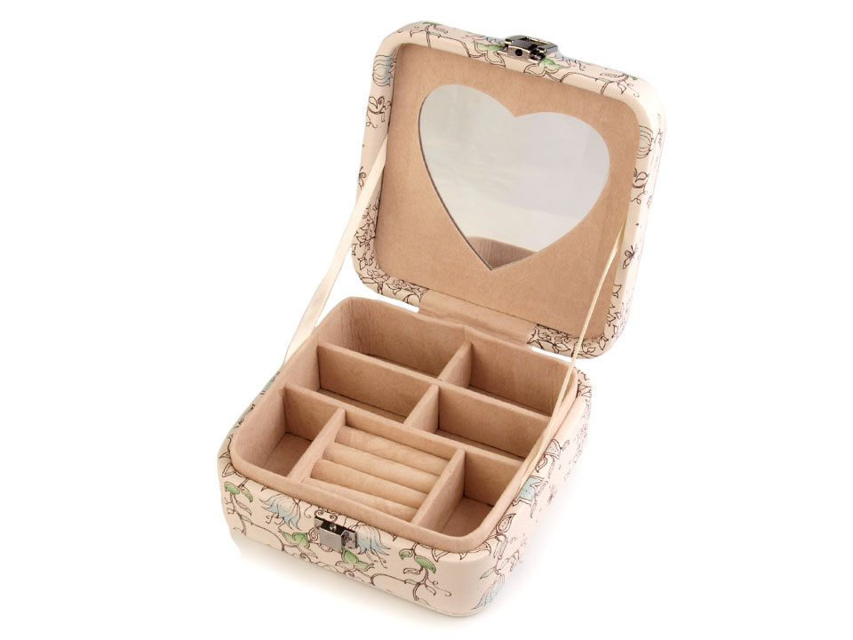 Uvnitř šperkovnice je 6 přihrádek, oddíl na prsteny a zrcátko. Šperkovnice má velice kvalitní a precizní provedení.