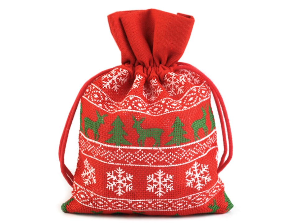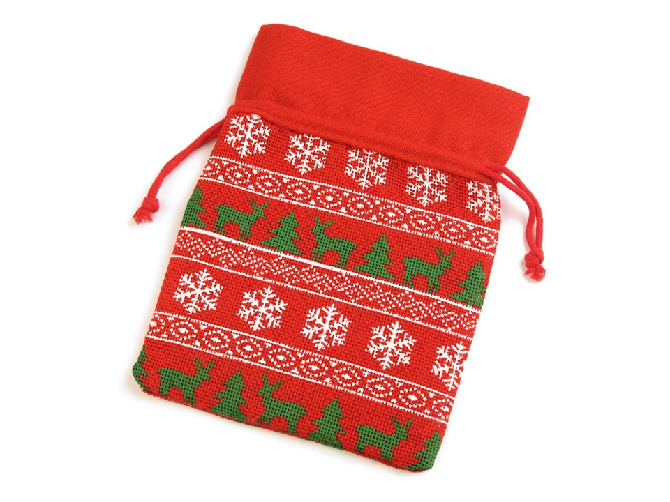 Pytlík s vánočními motivy se stahuje pomocí bavlněné šňůrky. Můžete ho použít na dárky nebo naplnit dobrotami na Mikuláše. Motivy jsou oboustranné.