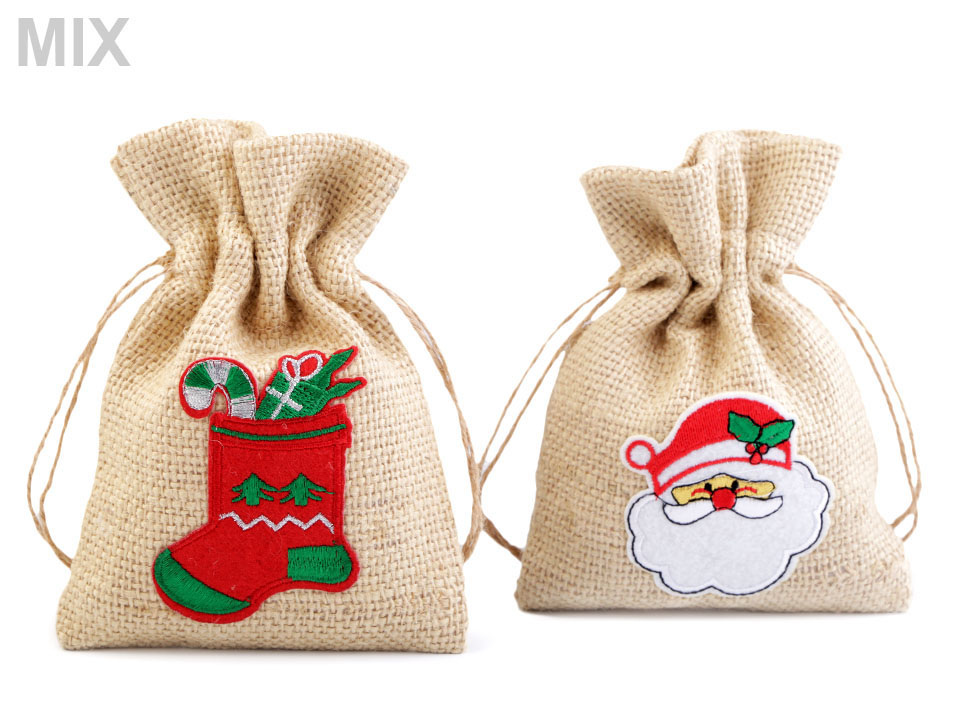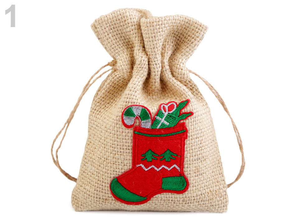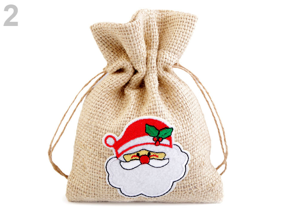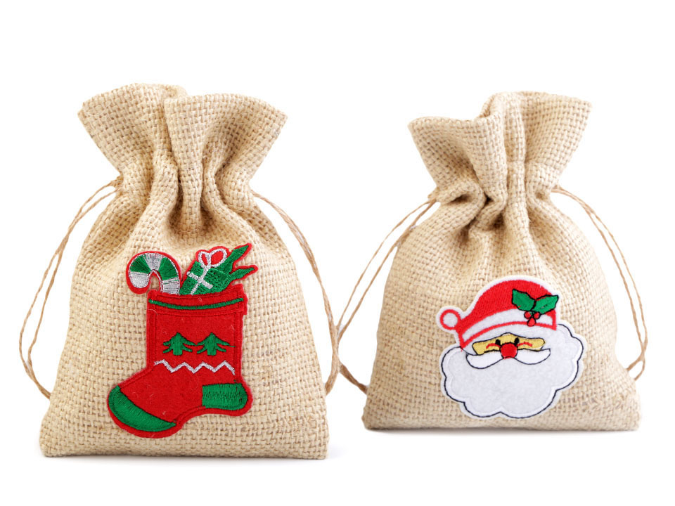 Jutový pytlík s vánočními motivy se stahuje pomocí šňůrky s korálky. Motiv je jednostranný.