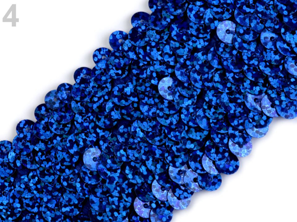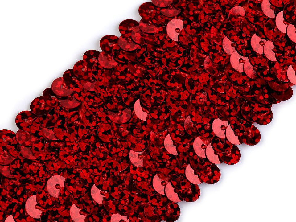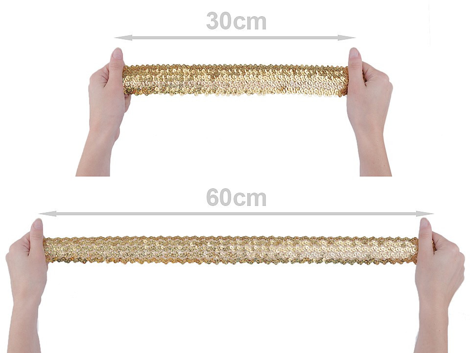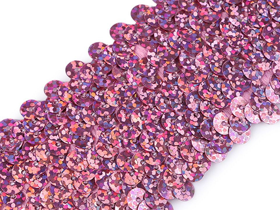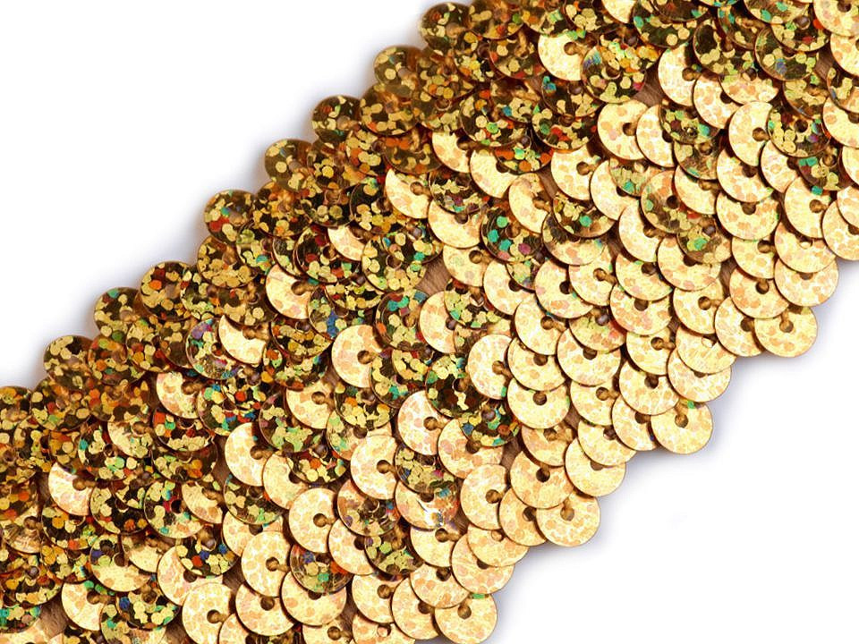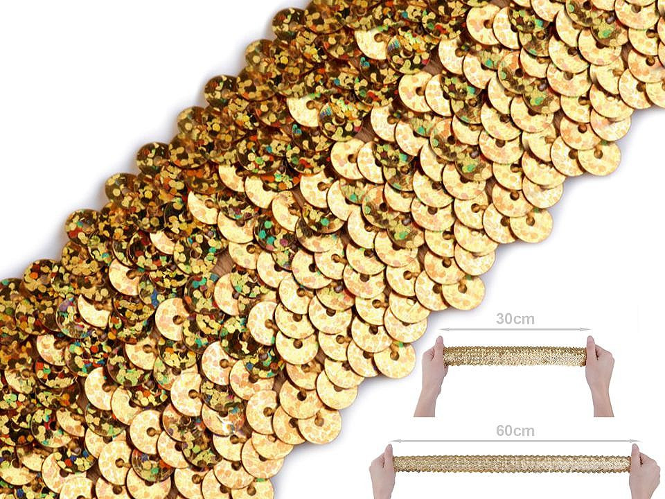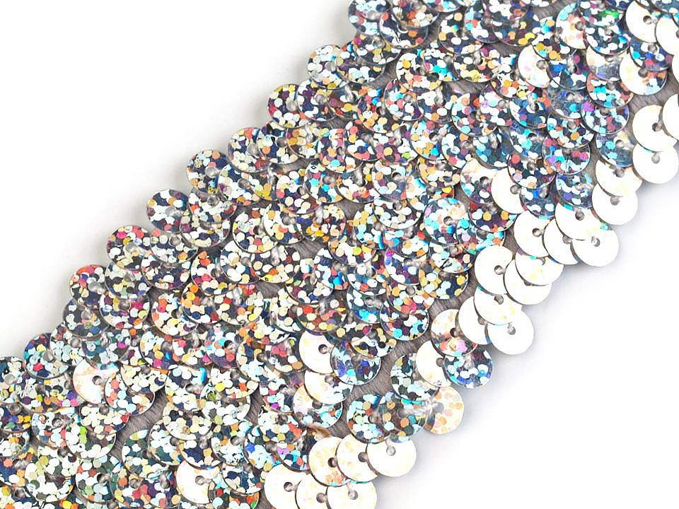 Prýmek zdobí hustě pošité flitry s hologramem. Díky gumě zašité ve spodní části je elastický. Flitry na prýmku se působivě třpytí.