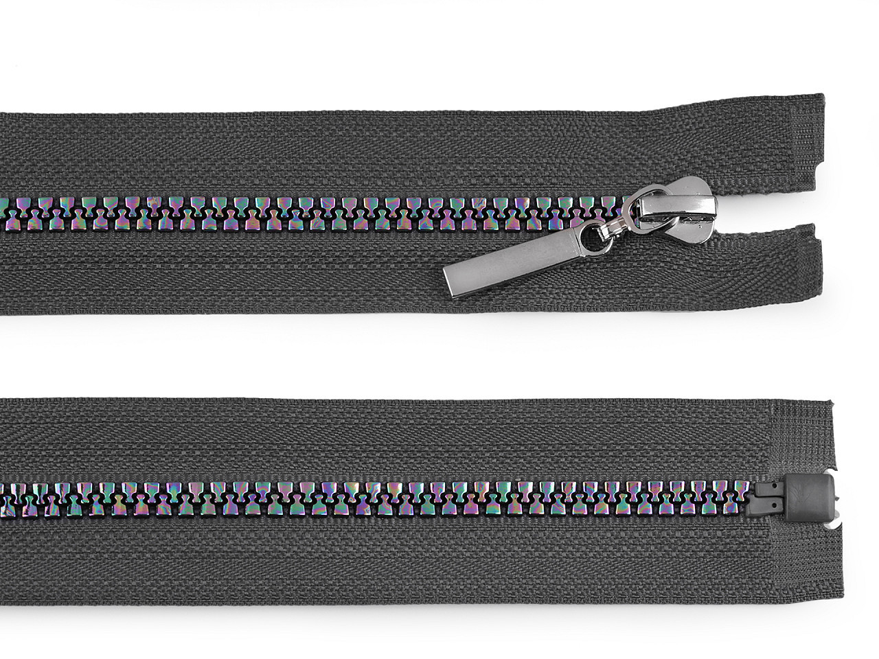 Dělitelný kostěný zip vás zaujme svým duhovým efektem, který povýší vaše oblečení na nevšední. Zip využijete na bundy, mikiny, svetry, apod.