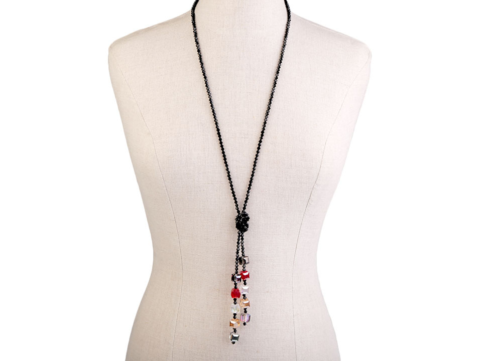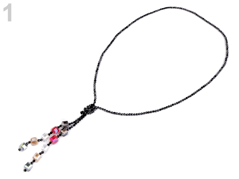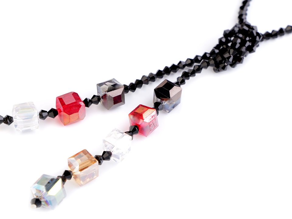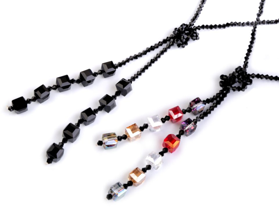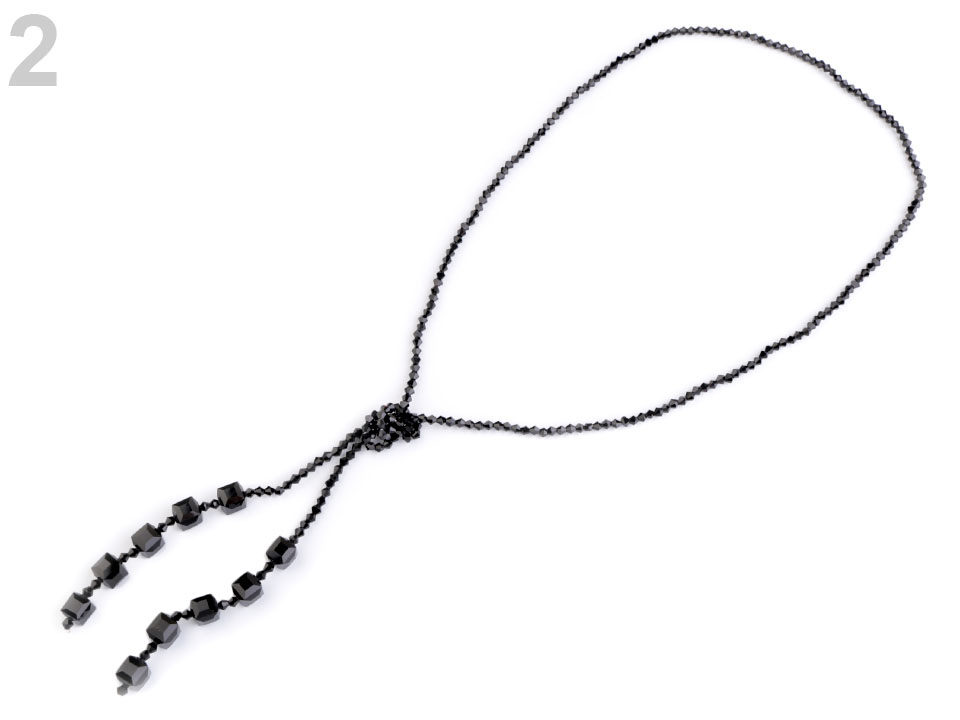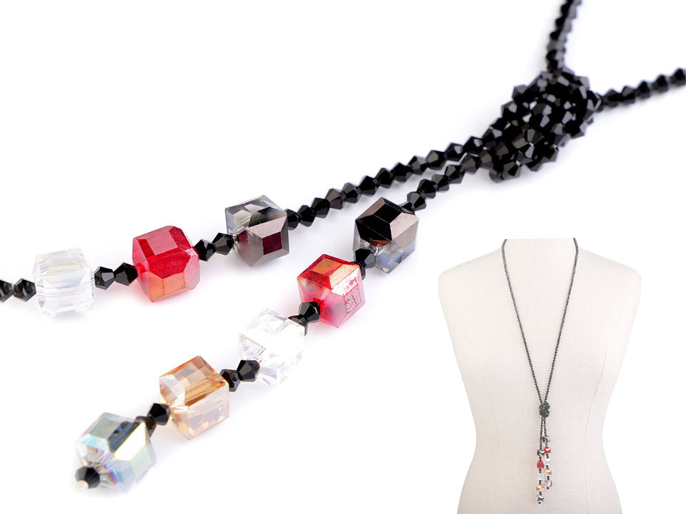 Trendový náhrdelník z broušených korálků patří mezi variabilní šperky. Můžete ho nosit klasicky s uzlem nebo jej rozvázat a nosit jen jako obtočenou šňůru kolem krku. Dá se nosit i zavázaný kolem pasu jako výrazný opasek.
