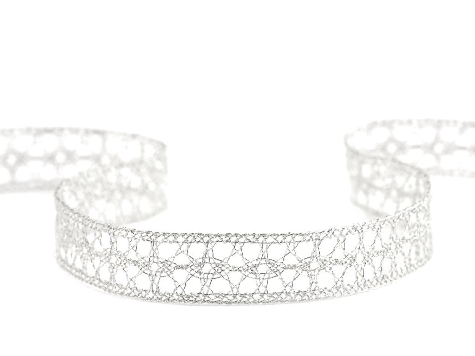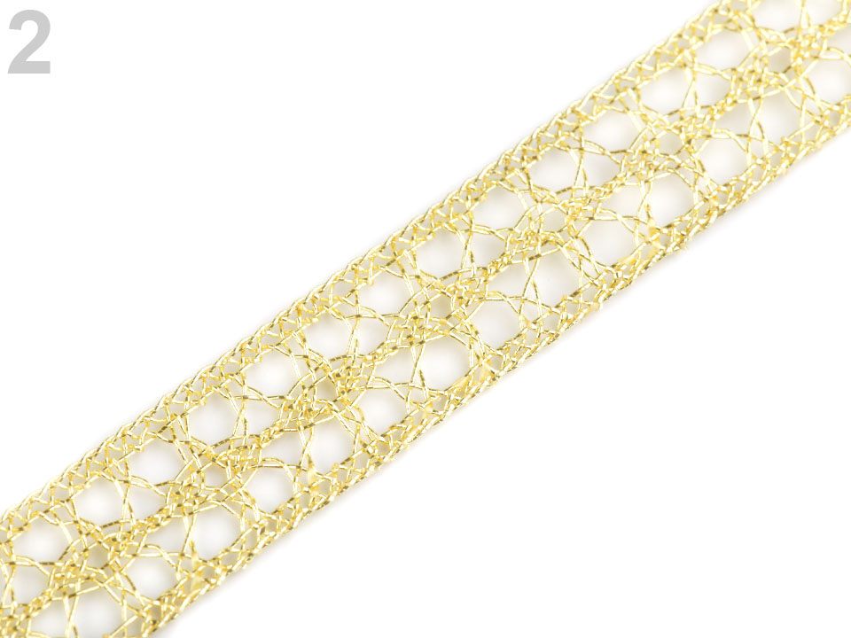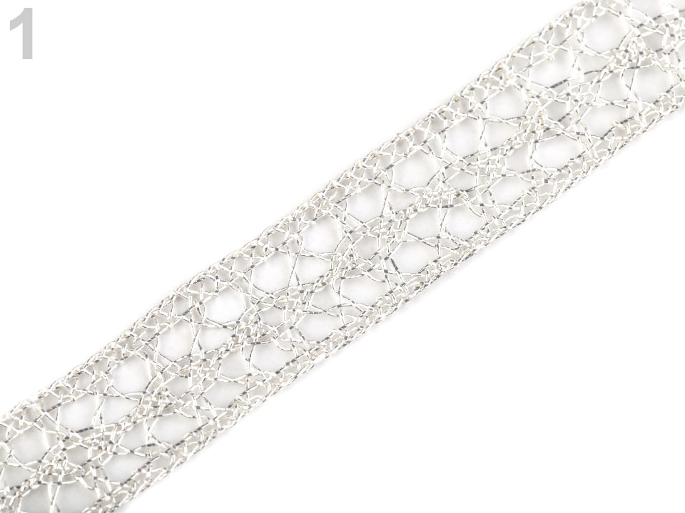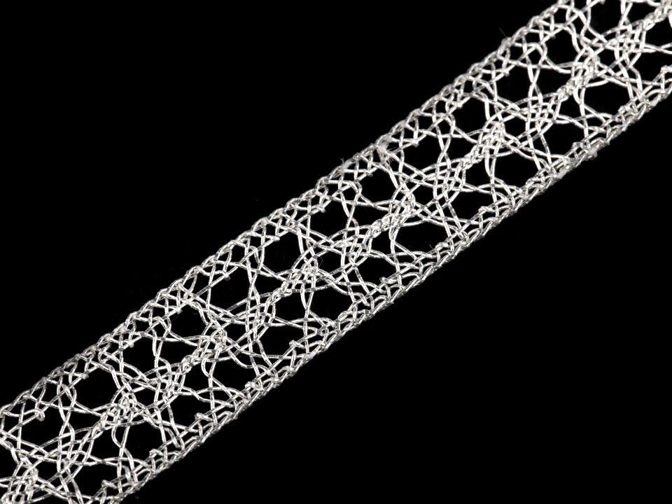 Leonská krajka se zajímavým pravidelným designem se díky kovovému vláknu krásně třpytí. Je pevná, není pružná.