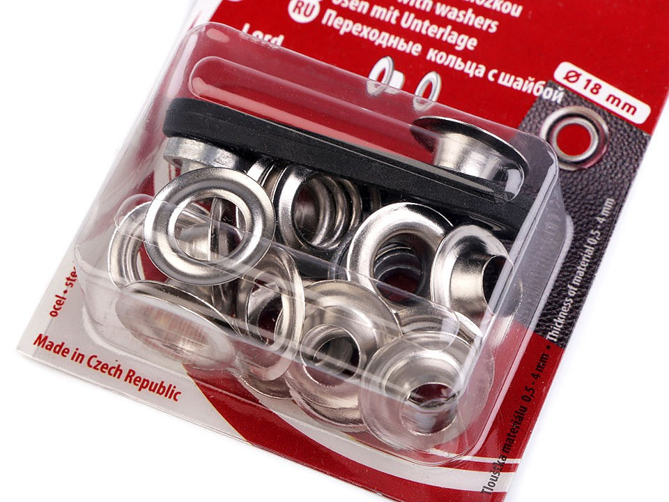 Plachtové kroužky se používají jako průchodky pro šňůry, nebo jako výstuž větracích otvorů. V blistru je 10 párů plachtových kroužků. Vnější průměr kroužků je 18 mm, vnitřní průměr je 8 mm. Jsou vyrobené z kovu a hrozí jím rezivění.