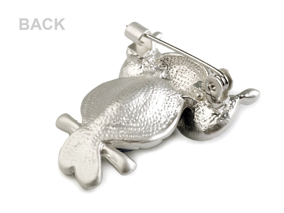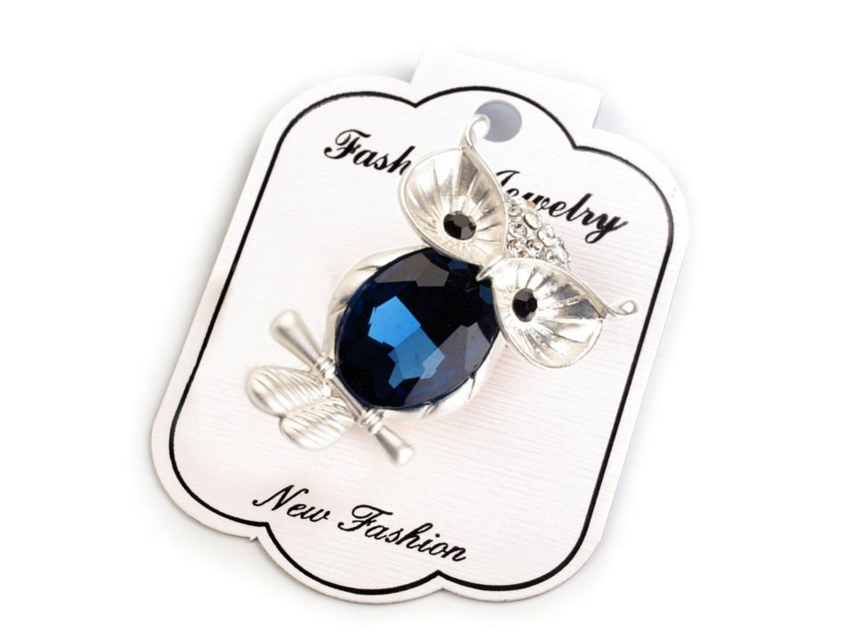 Hlavu má osázenou třpytivými kamínky. Brož má z rubu brožový špendlík. Je na kartě, která se dá zavěsit na prodejní stojany.