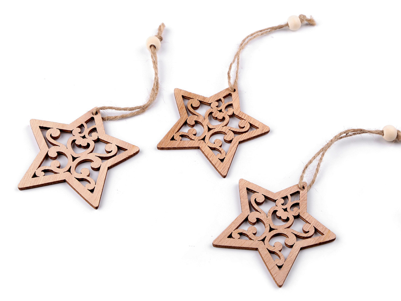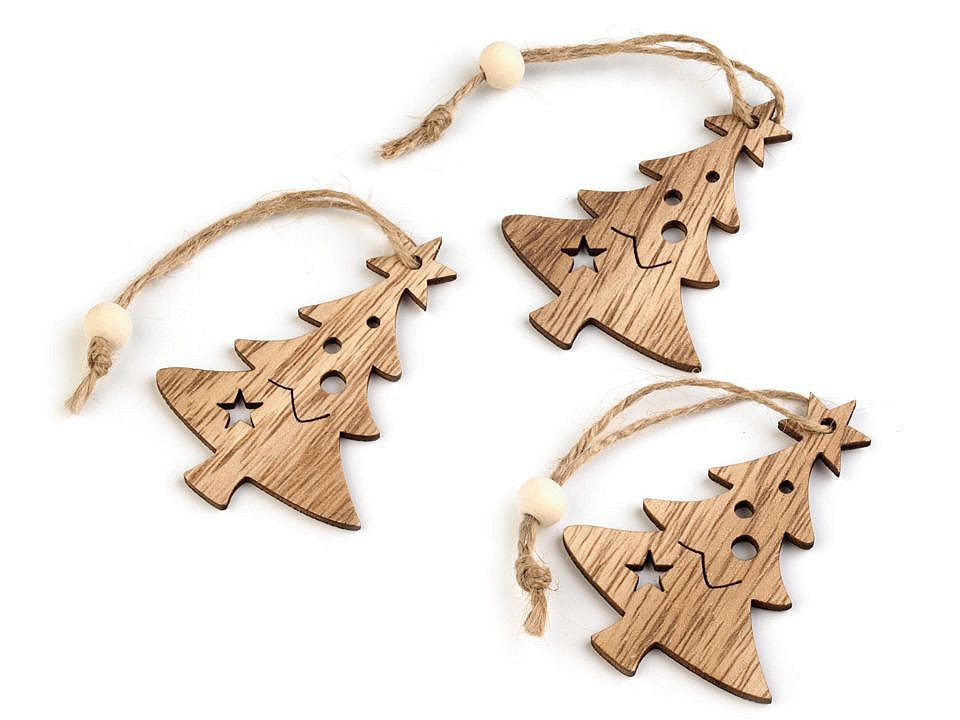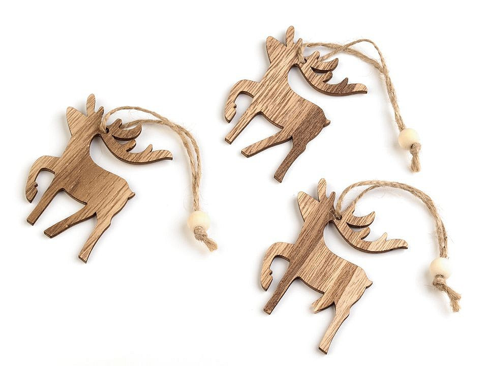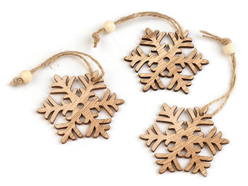 Dřevěné vánoční dekorace ve tvaru vločky, stromku a soba mají přírodní dřevěný povrch s krásnou přirozenou strukturou. Díky připevněnému poutku z juty a korálků je můžete pověsit na stromek, na dveře, do oken nebo volně do prostoru. Budou se vyjímat i jako ozdoba na slavnostně zabaleném dárku.