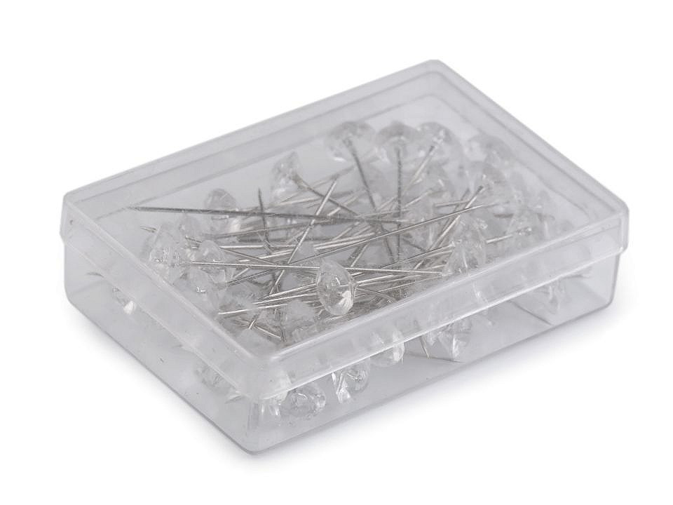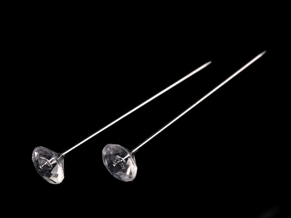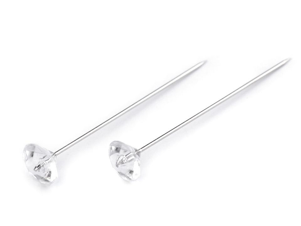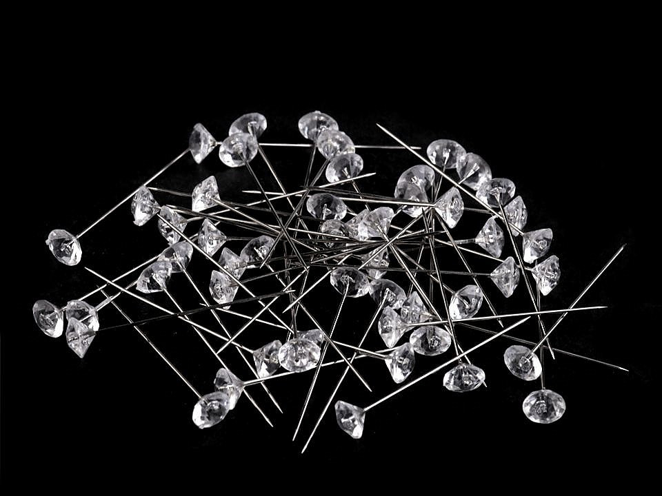 Ozdobný špendlík má transparentní hlavičku ve tvaru diamantu. Slouží jako ozdoba k upevnění organzy, svatebních prstenů, aranžmá živých květů atd.