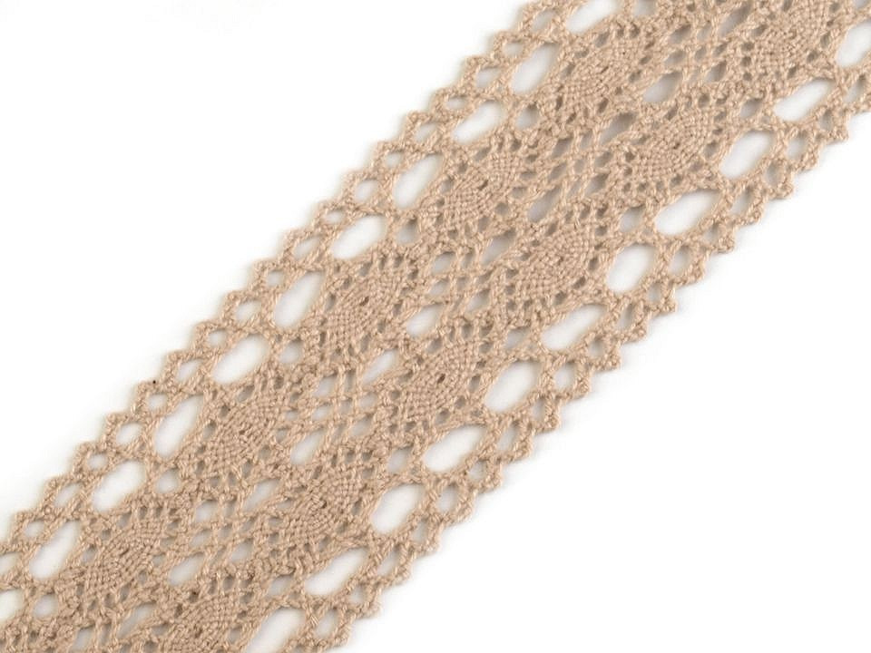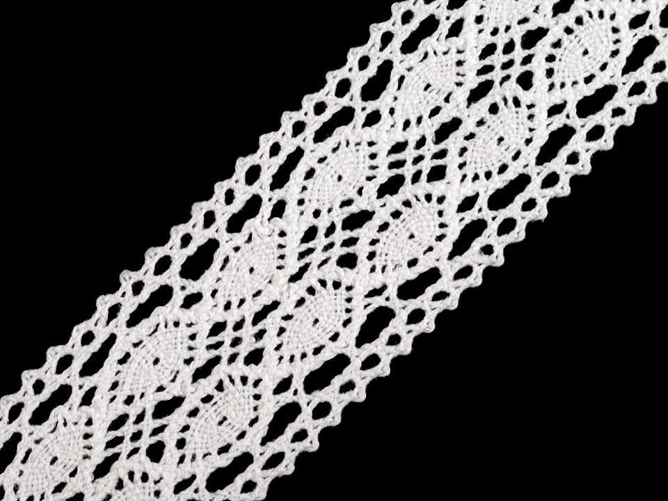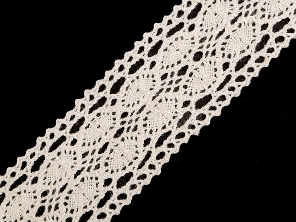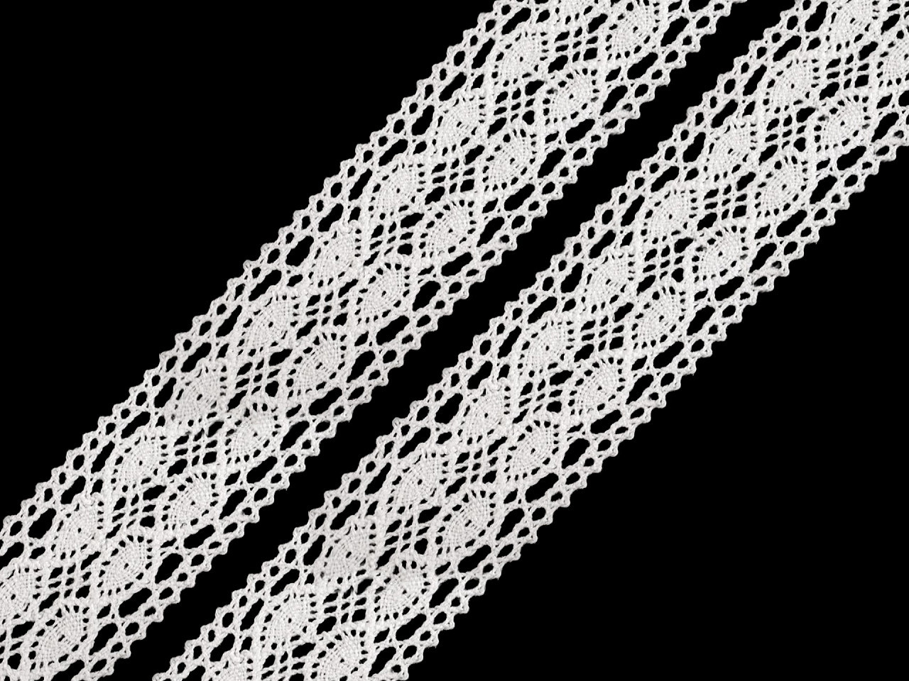 Bavlněná paličkovaná krajka se zajímavým vzorem má okraje zakončené očky. Doporučujeme ji žehlit přes tkaninu.