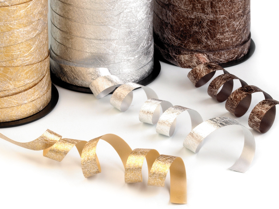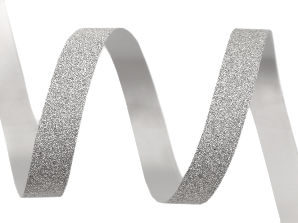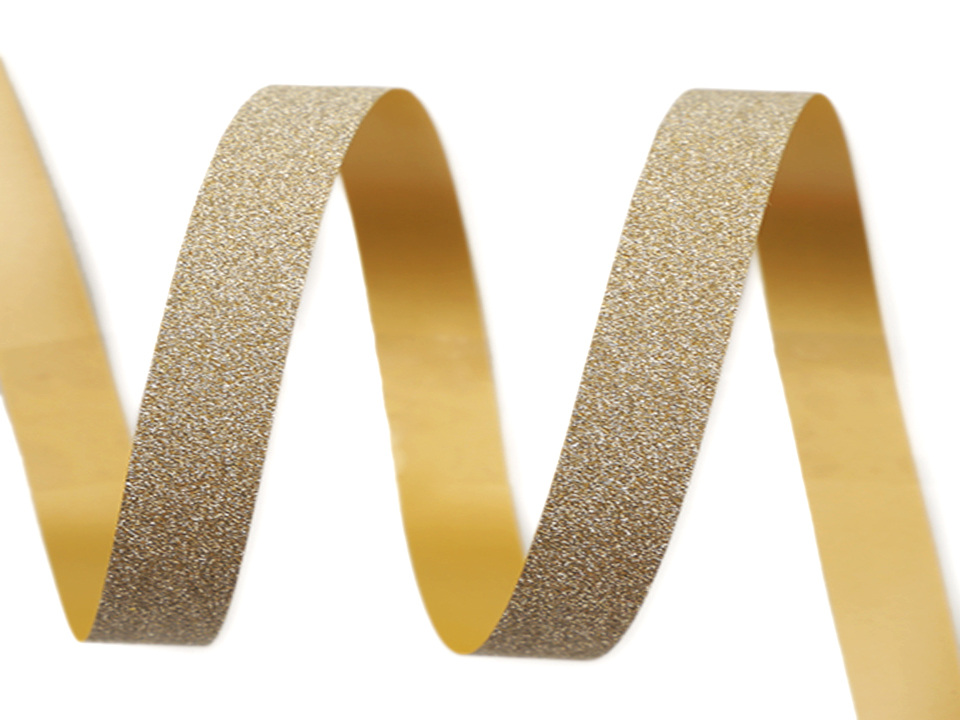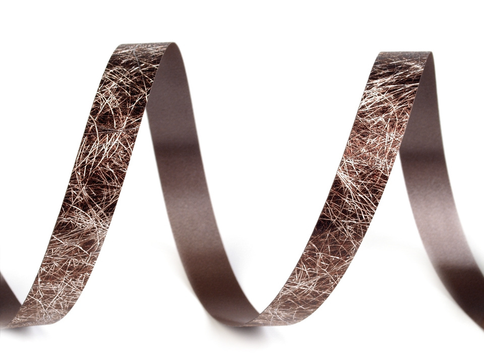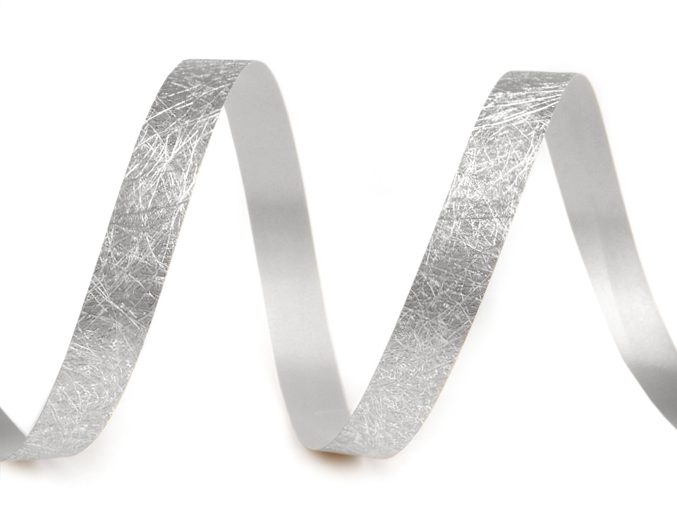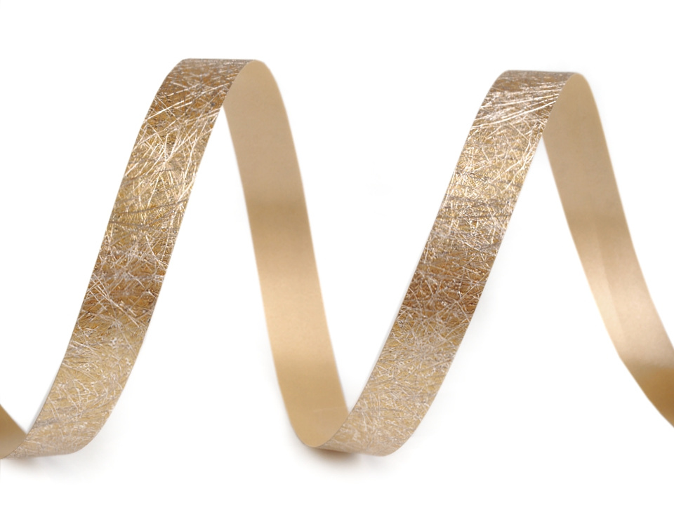Metalická stuha se poutavě leskne a působí luxusně. Je pevná, lícová strana má jemný reliéf, který připomíná pavučinku, rubová strana je hladká.