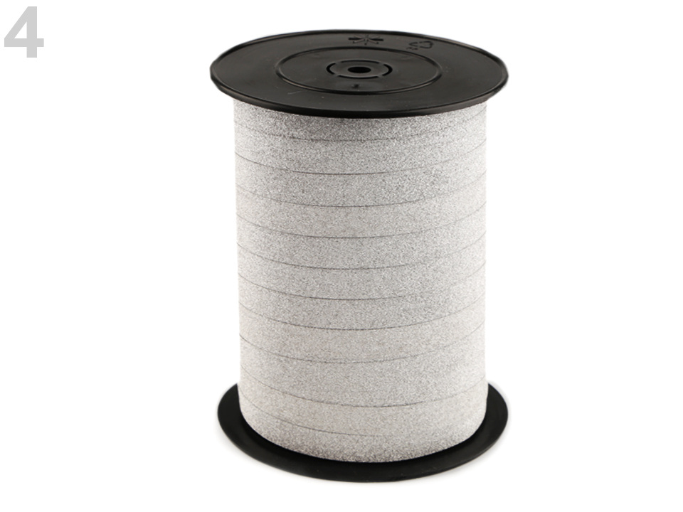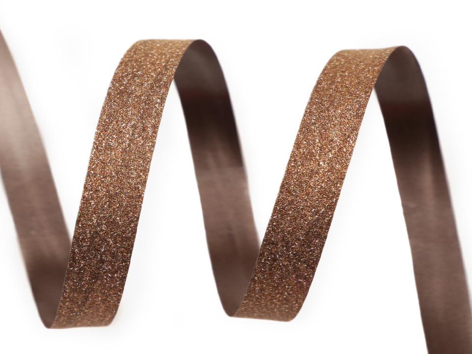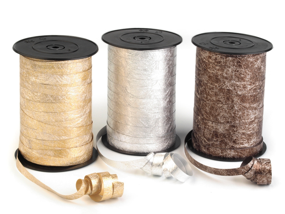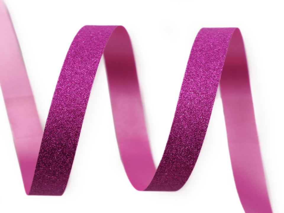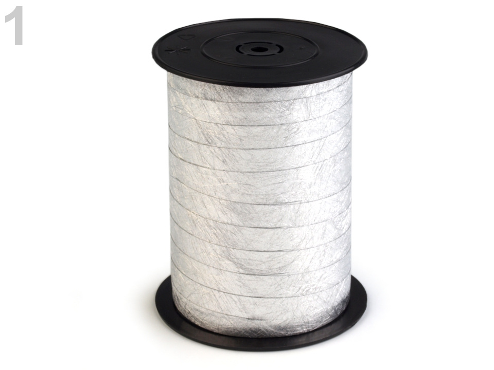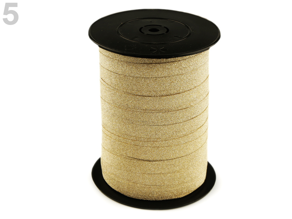 Metalická stuha se poutavě leskne a působí luxusně. Je pevná, lícová strana má jemný reliéf, který připomíná pavučinku, rubová strana je hladká.