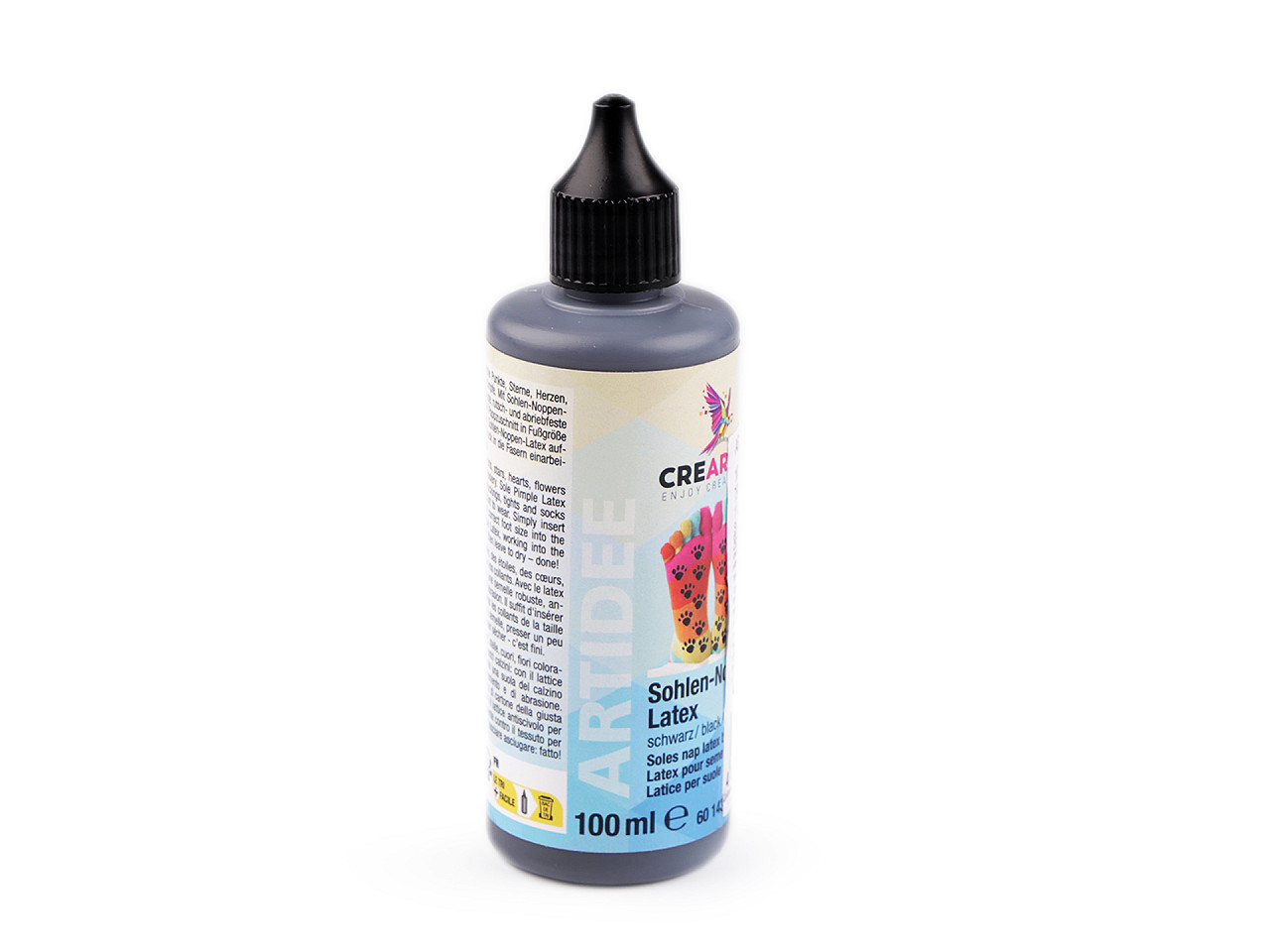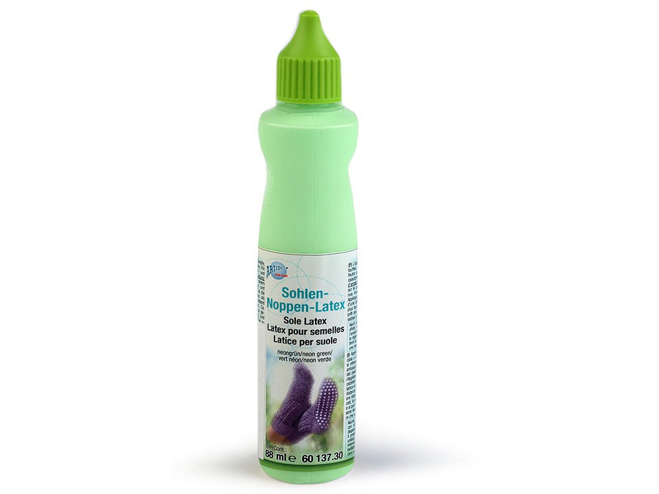 Návod k použití: položte nohu na pevnou lepenku. Obtáhněte kontury chodidla fixem a otisk vystřihněte nůžkami. Vsuňte lepenku do vybrané ponožky nebo punčochy, aby se vytvořila pevná podrážka a mohli jste na ni nanést malé latexové tečky. Latexová hmota se přímo nanáší tenkým otvorem v trysce na lahvičce. Vytvářejte malé puntíky v rozmezí 5-6 mm. Doba schnutí je 8-10 hodin. Poté vyjměte lepenku. Ponožky či punčochy jsou pak ihned připraveny k použití.