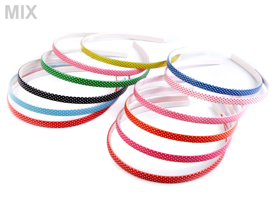 Puntíkované čelenky pro dospělé i děti. Jsou z kvalitního plastu s potiskem drobných puntíků.