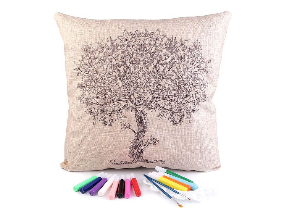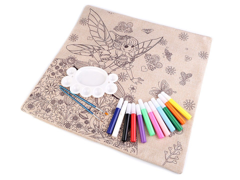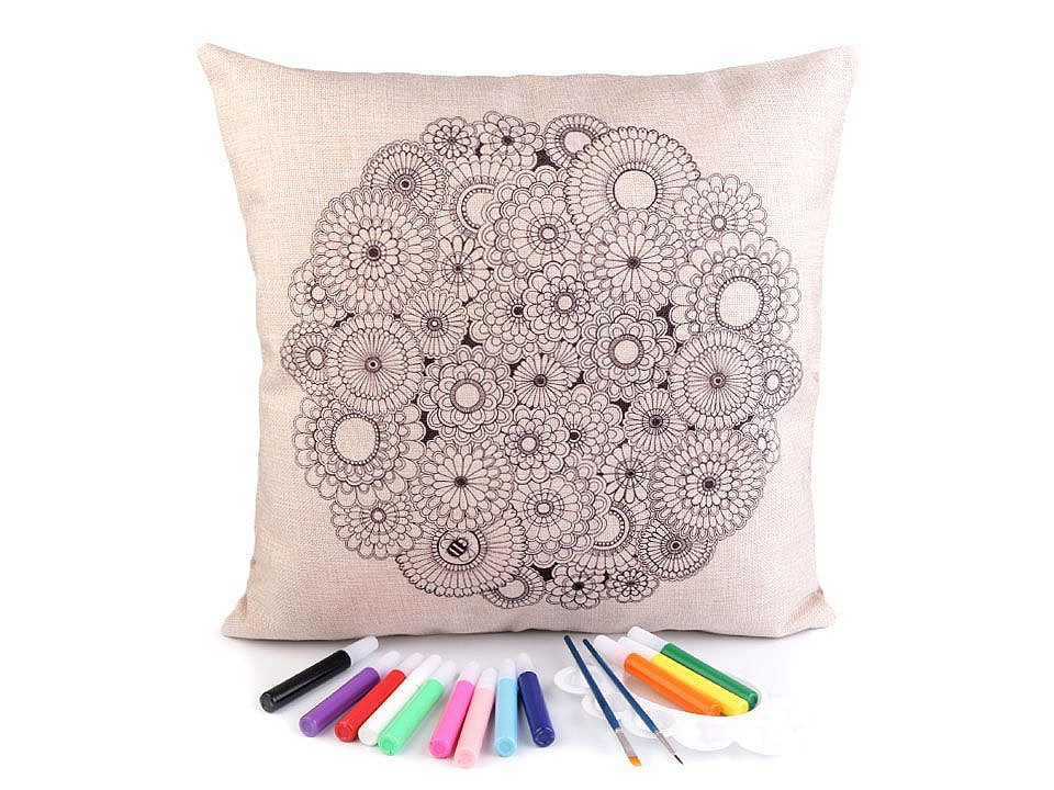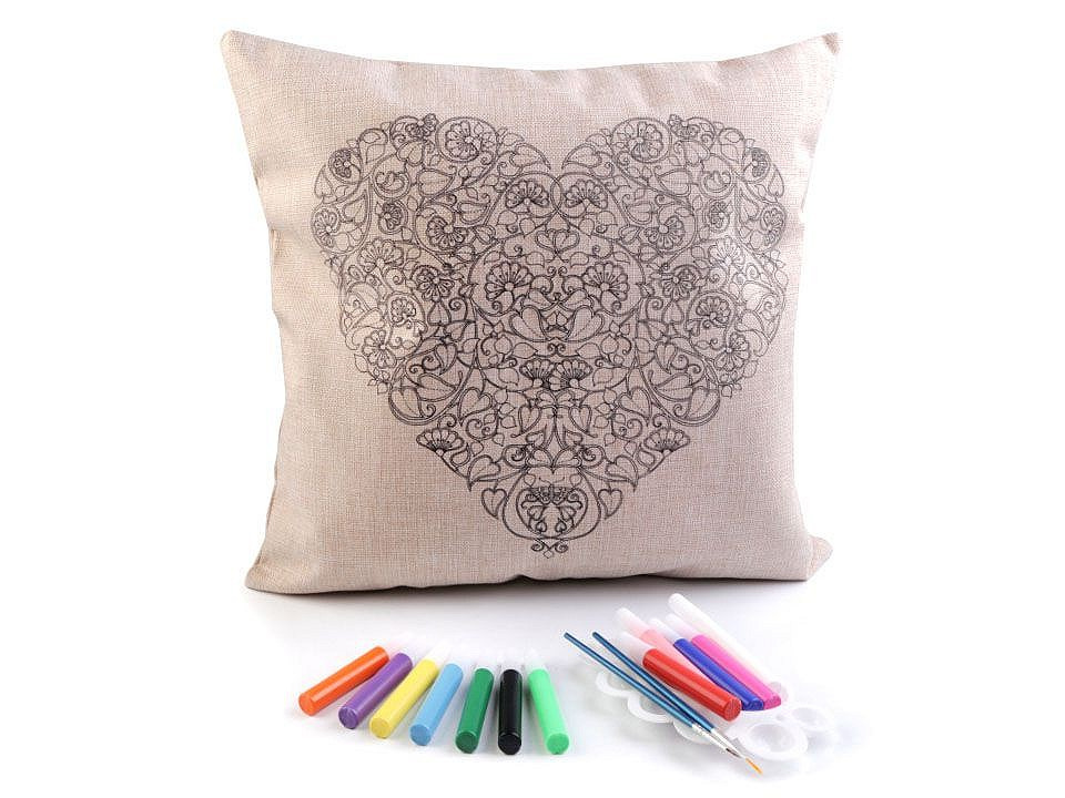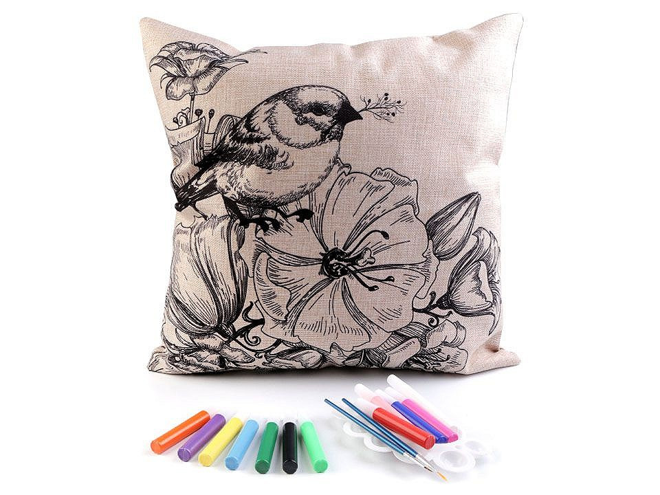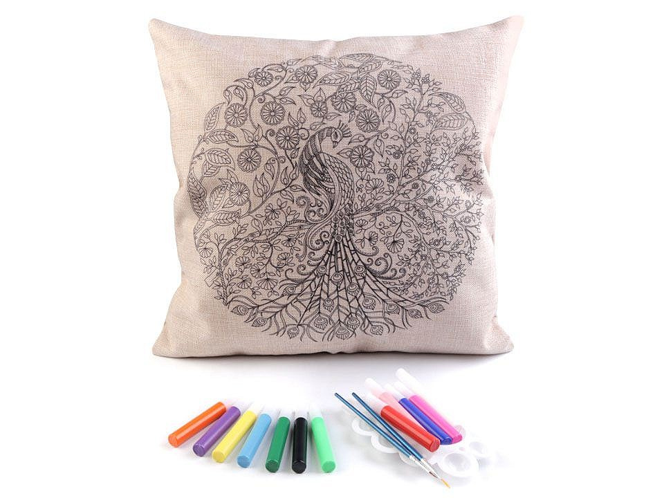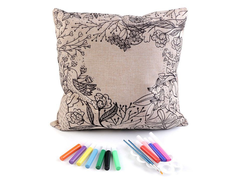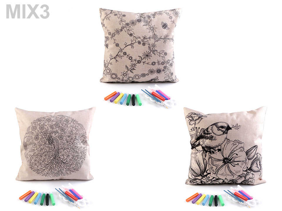 Polštář má lněný vzhled, zapíná se na zip. Předtištěný motiv je pouze na jedné straně. Barvy v tubách mají krásné pestré barvy.