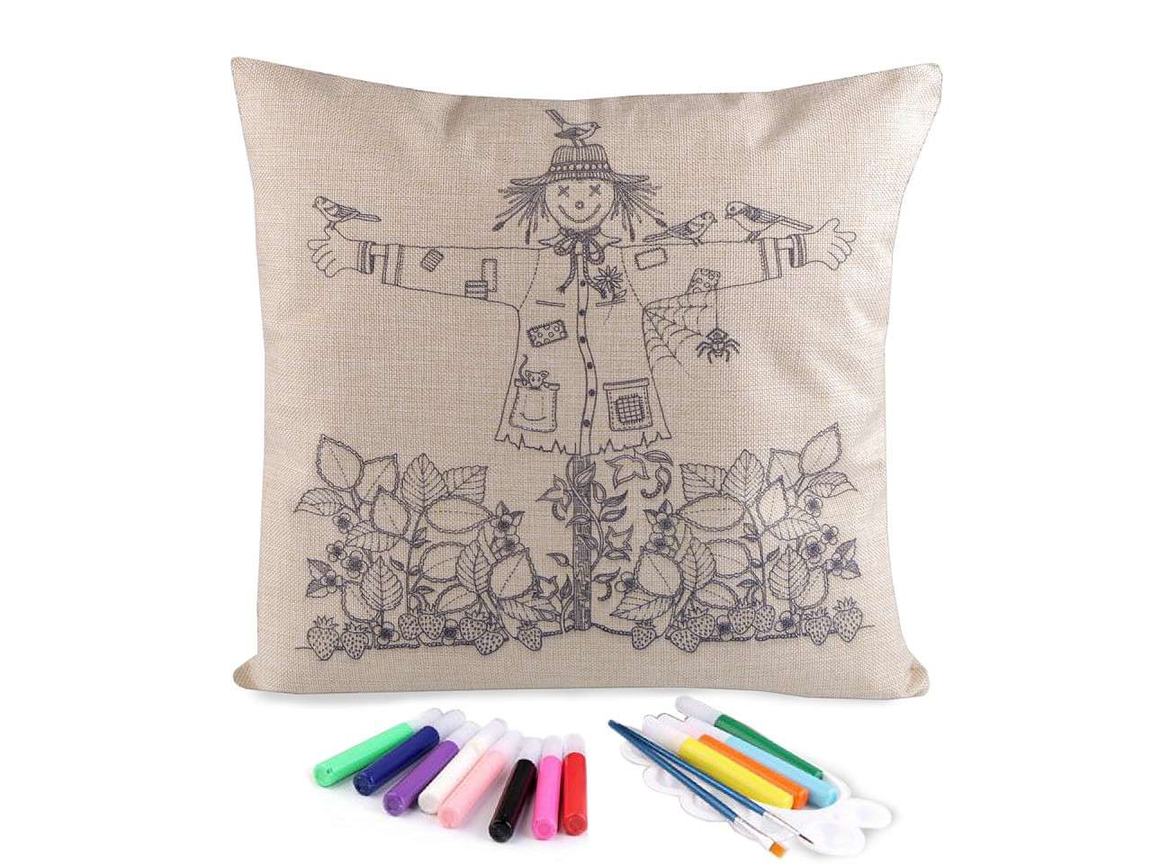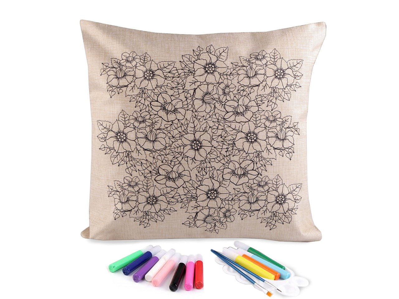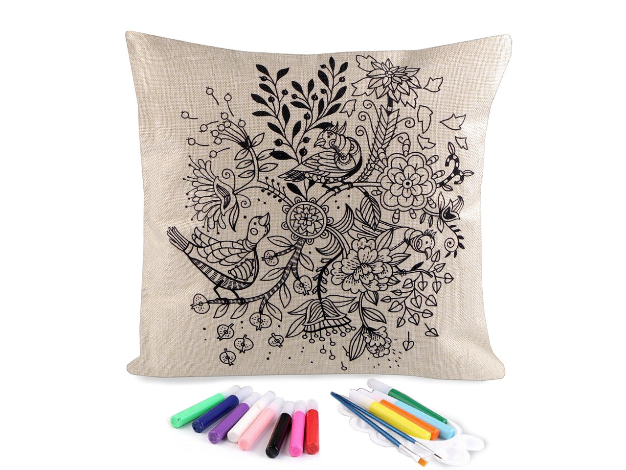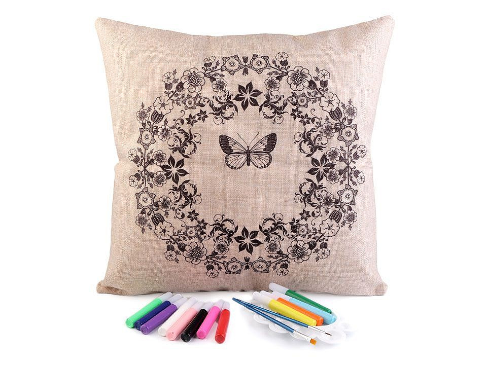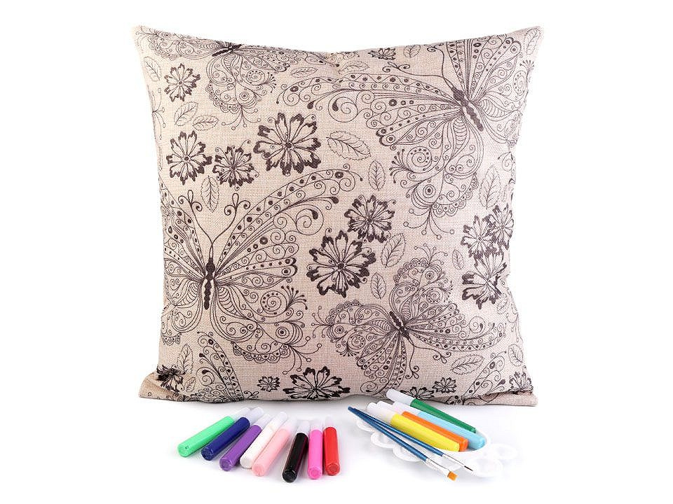 Polštář má lněný vzhled, zapíná se na zip. Předtištěný motiv je pouze na jedné straně. Barvy v tubách mají krásné pestré barvy.