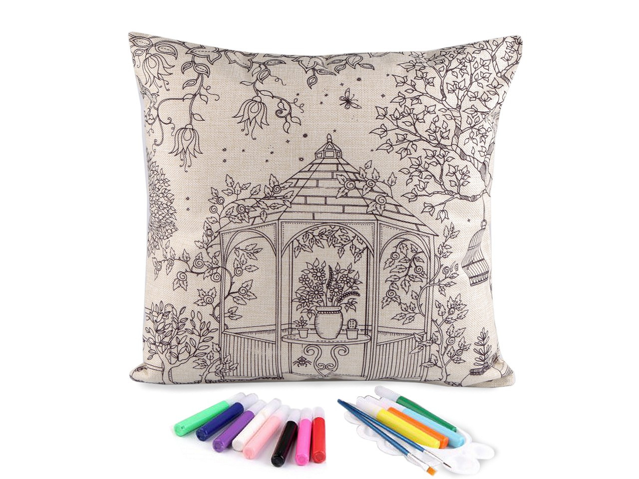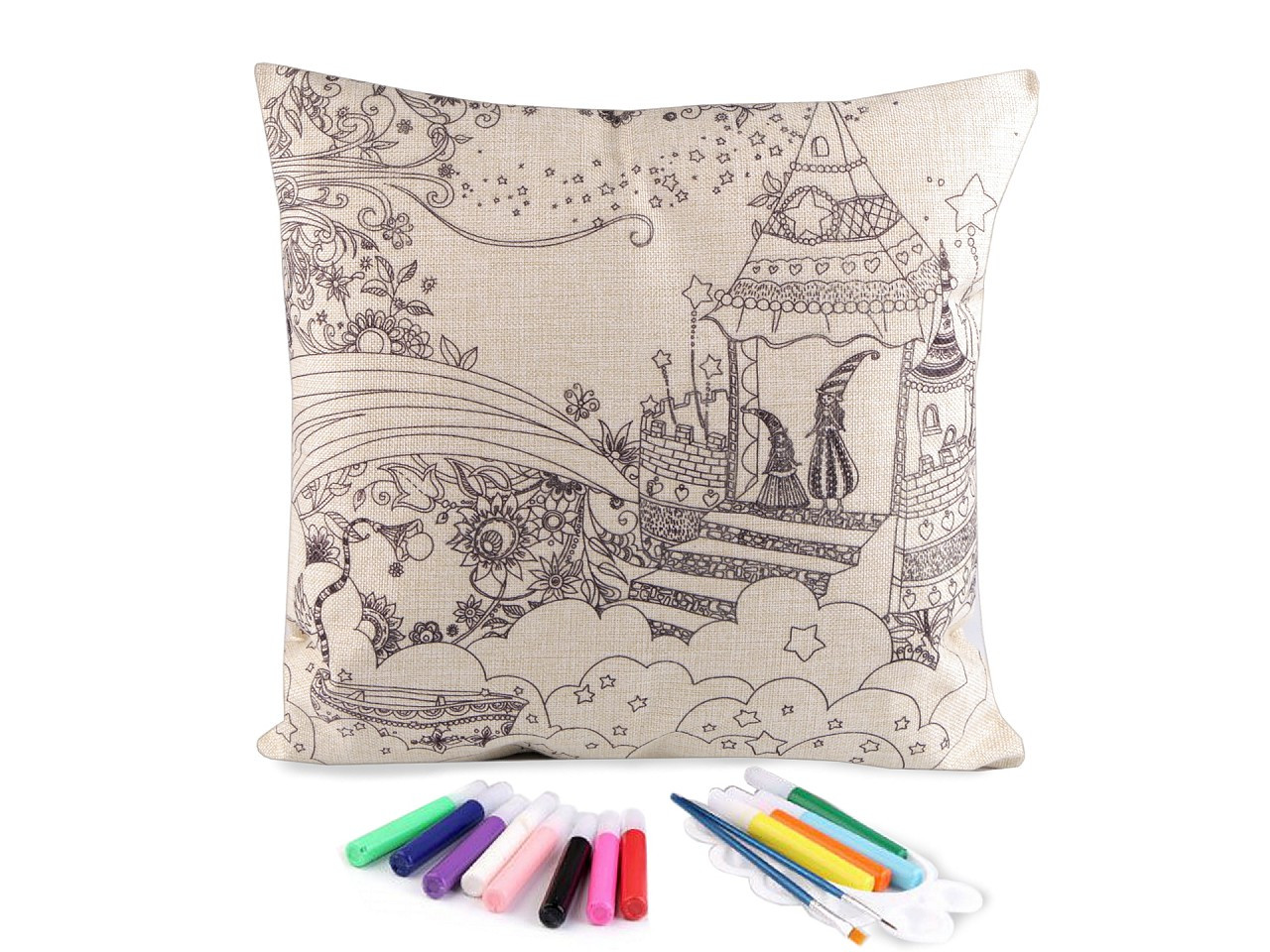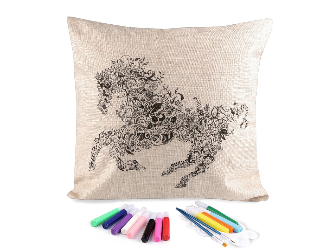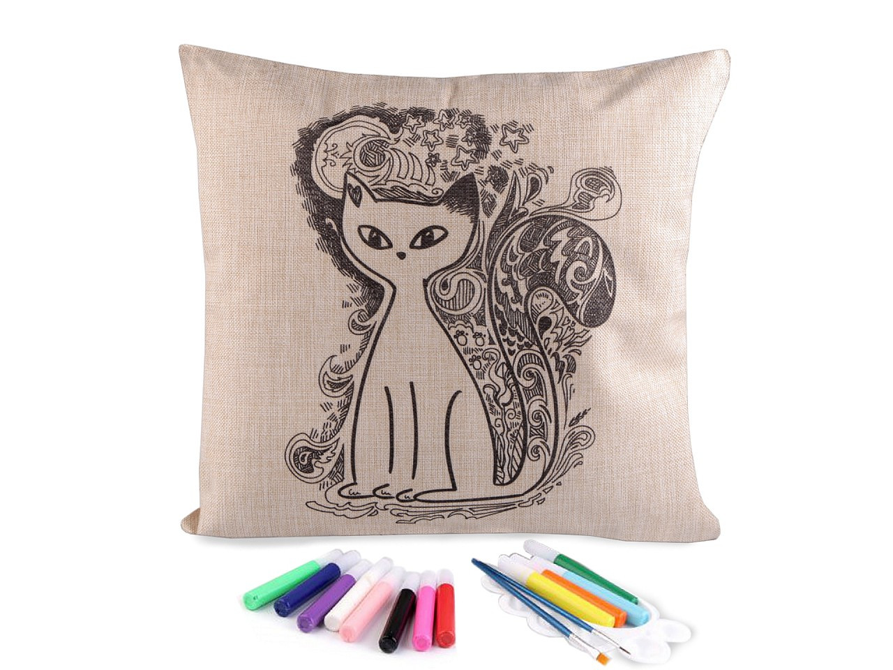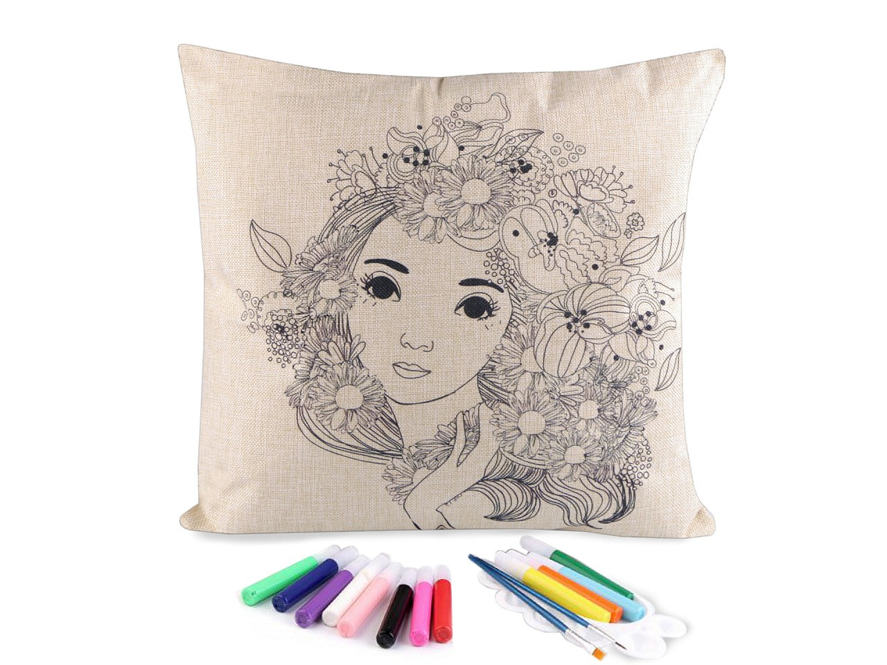 Polštář má lněný vzhled, zapíná se na zip. Předtištěný motiv je pouze na jedné straně. Barvy v tubách mají krásné pestré barvy.