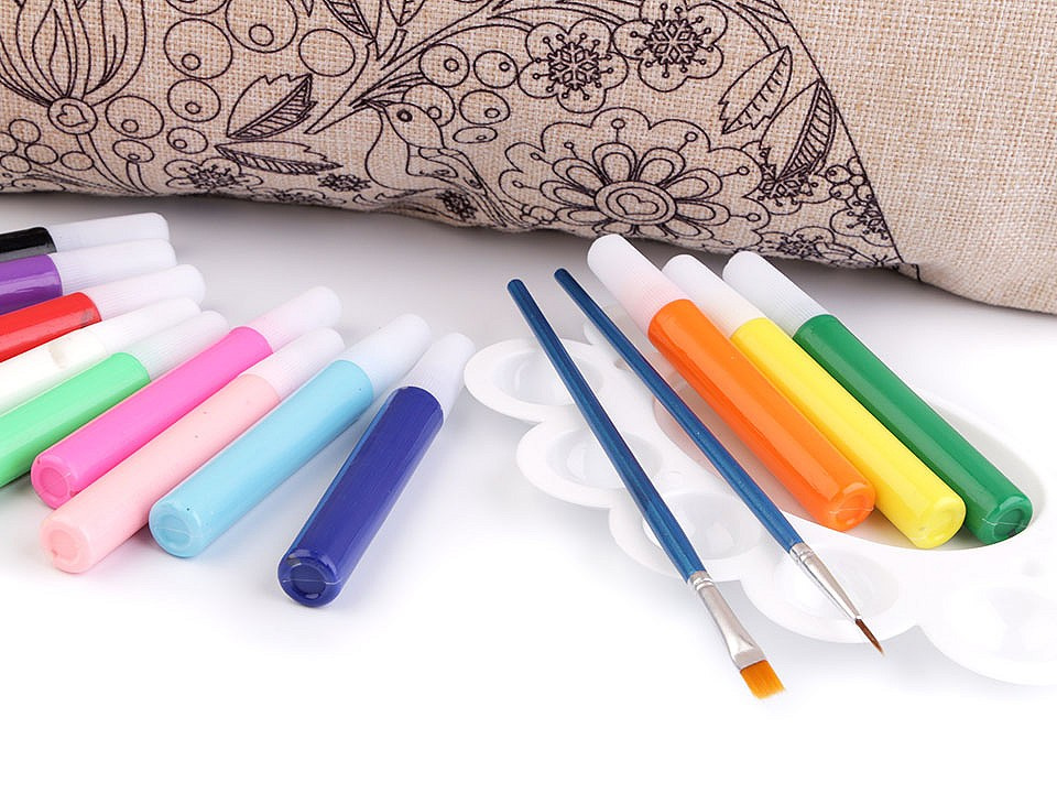 Návod: před malováním vložte do polštáře podložku (např. tvrdý papír), aby nedošlo k prosáknutí barev na druhou stranu polštáře. Barvy nanášejte přímo, není potřeba je ředit vodou. Barvy mezi sebou můžete míchat.