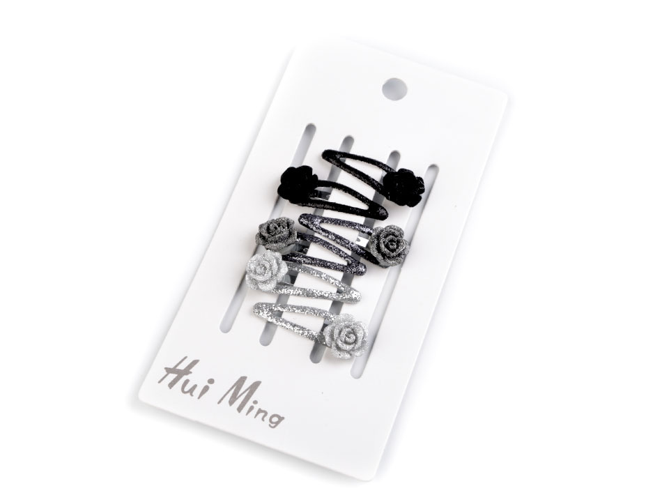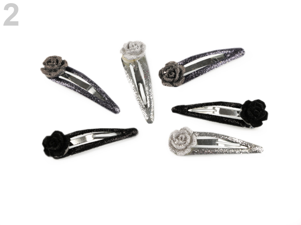Slavnostní pukačky s růží a glitry vypadají velice elegantně. Jsou malé, ve vlasech pevně drží, nesjíždějí, udrží i jemný pramínek vlasů. Jsou vyrobené z kvalitního materiálu, který dlouho drží svůj tvar, funkčnost i barvy.