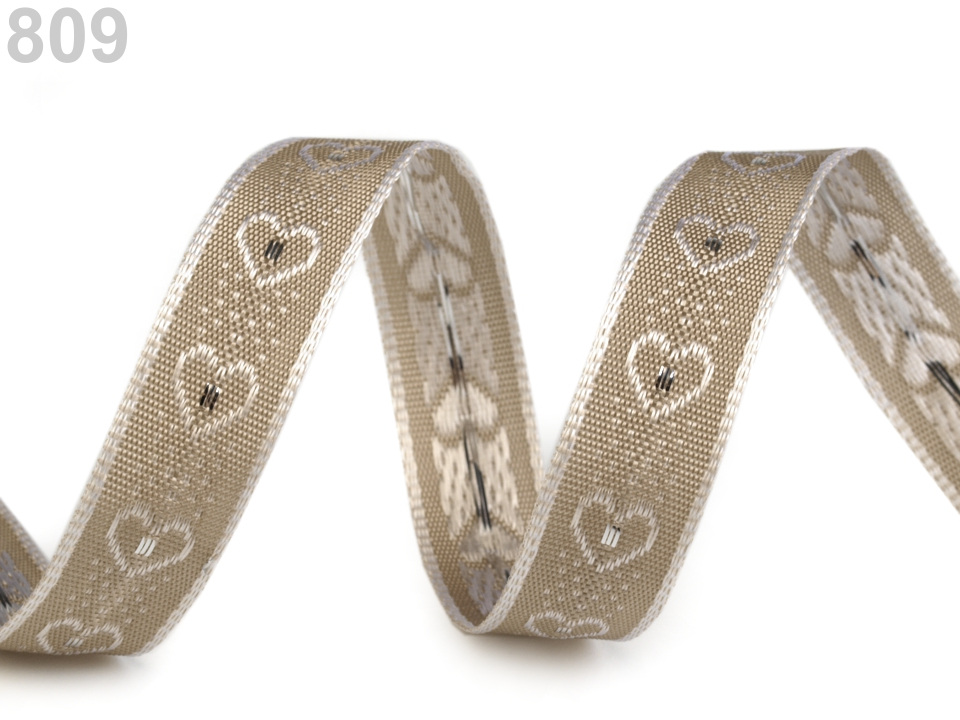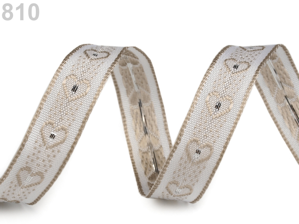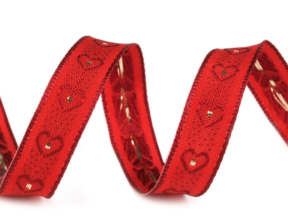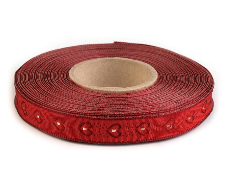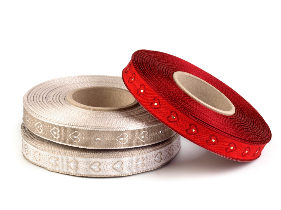 Stuha s vytkávaným vzorem srdíček je vhodná k různým dekoračním účelům. Okraje jsou zpevněny drátem a perfektně drží tvar.