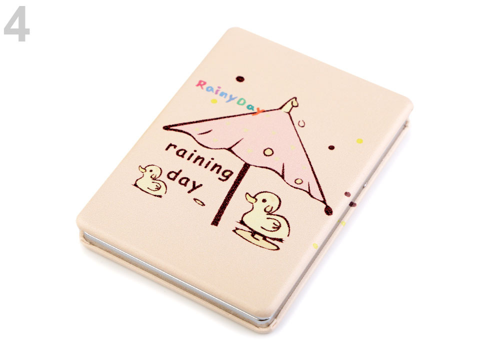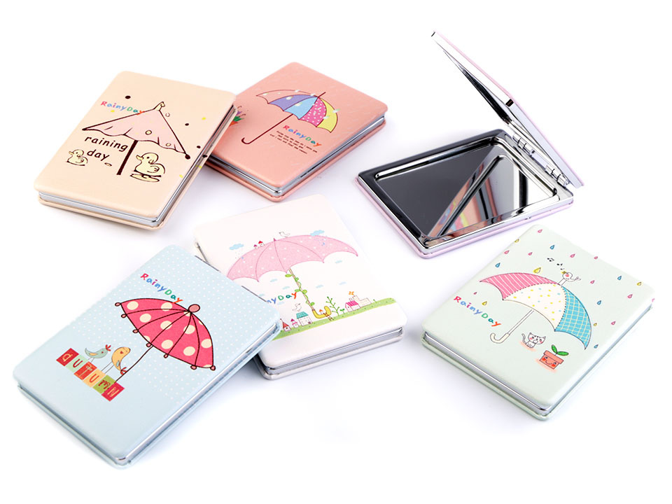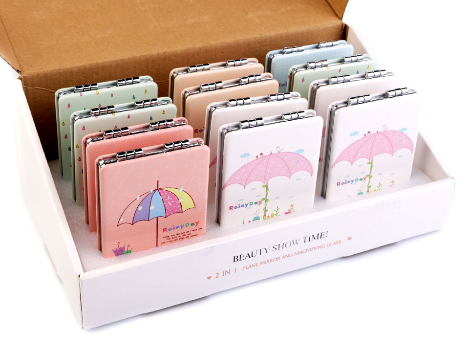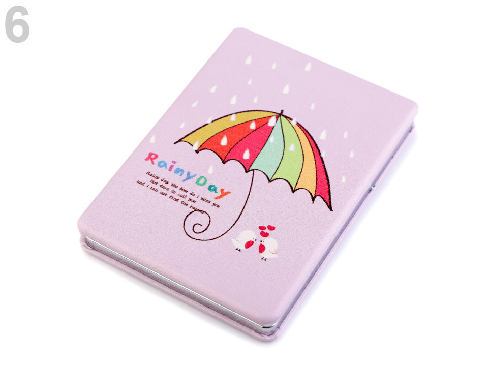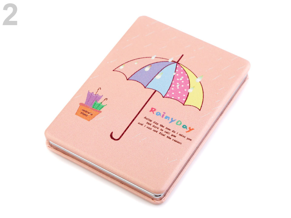 Má kvalitní zpracování z eko kůže s potiskem s motivem deštníku. Uvnitř jsou 2 zrcátka, jedno je zvětšovací.