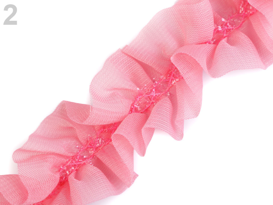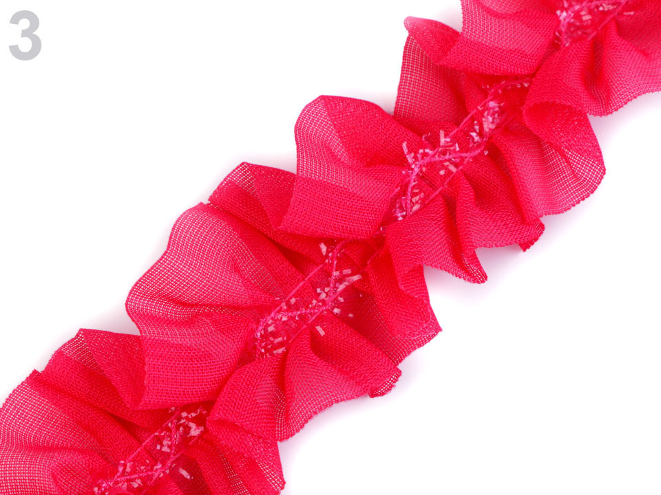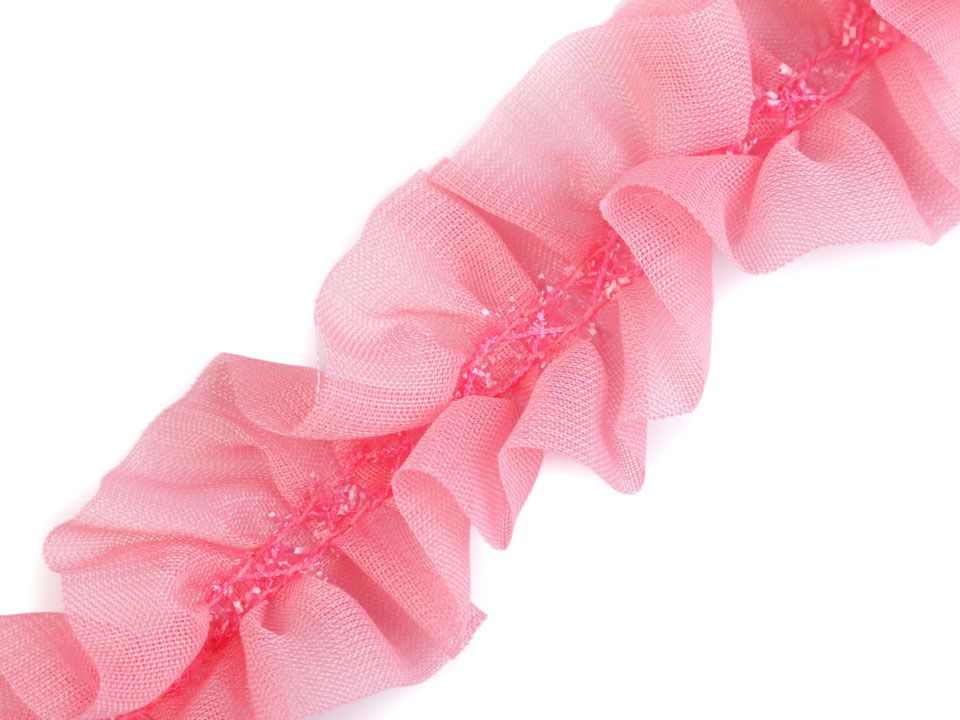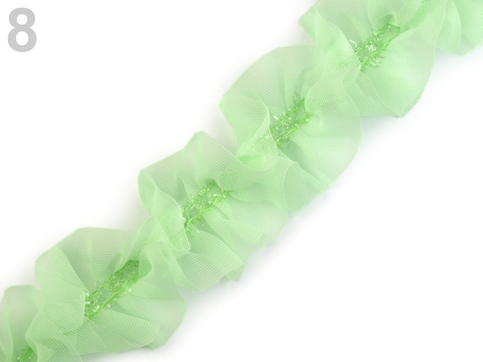 Volánkový prýmek je vyrobený z monofilu. Uprostřed je zdobený nitkou s průhlednými třásněmi, které se jemně třpytí.