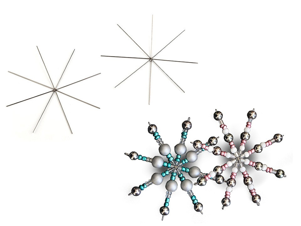 Na jednotlivé paprsky můžete navlékat korálky, perličky, velice efektně vypadají voskované perle. Skládá se ze 4 drátů, jež tvoří 8 paprsků. S tímto drátěným základem vytvoříte okouzlující vánoční vločky a hvězdy velmi snadno a hravě. Stačí navléknout korálky a na konci drátku zatočit očko pomocí kulatých bižuterních kleští. Hotovou hvězdu můžete zavěsit pomocí háčku nebo šňůrky na stromeček, do okna apod.