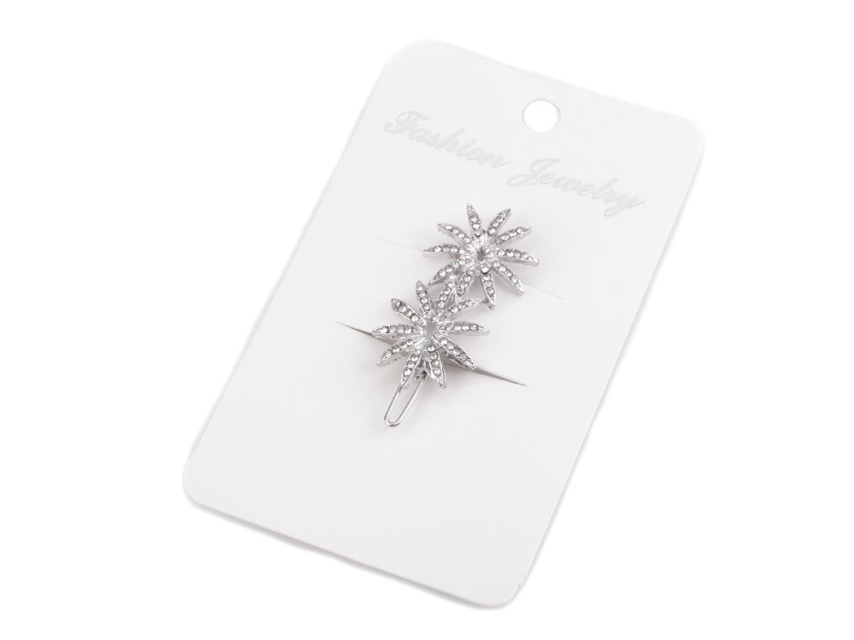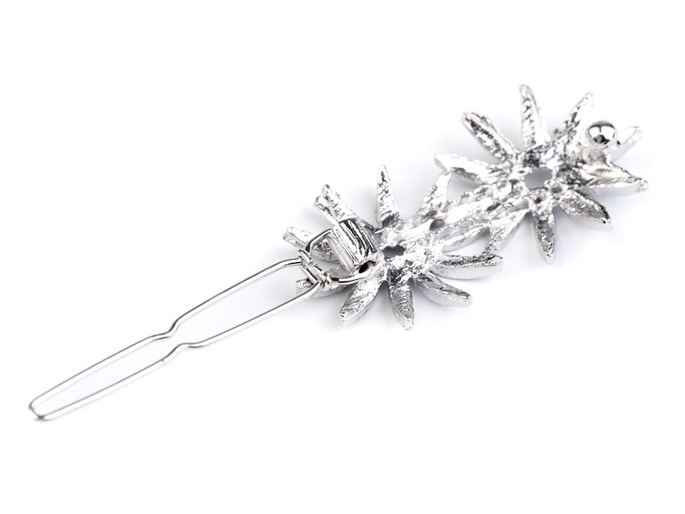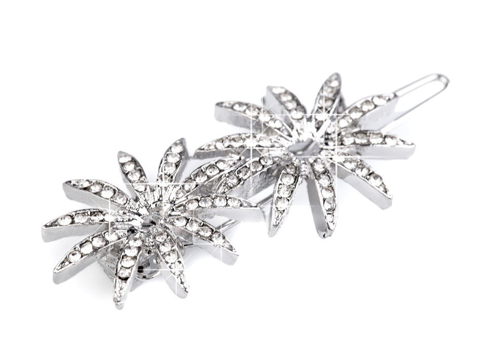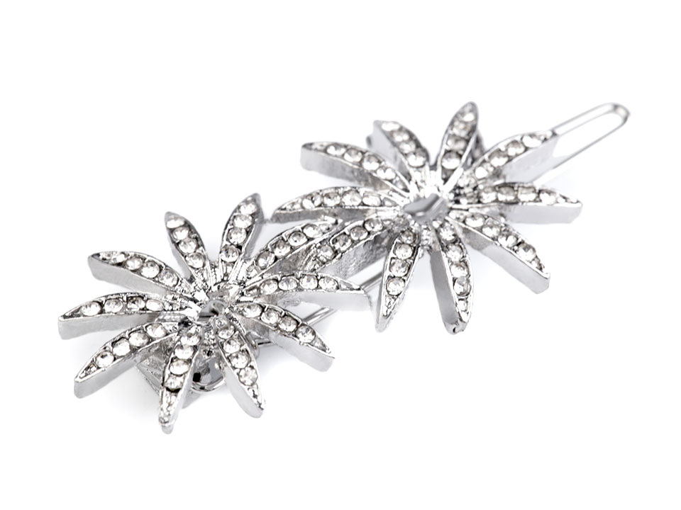 Kovová sponka se štrasovými květy vypadá velice romanticky. Díky kamínkům se působivě třpytí.