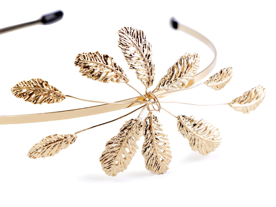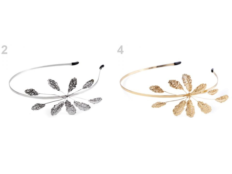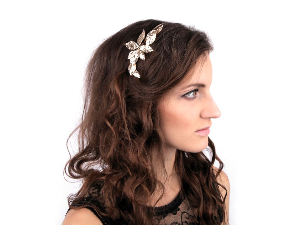 Kovová čelenka s listy se hodí pro romanticky založené ženy. Slavnostně dozdobí účes pro jakoukoliv příležitost, ať už jdete na ples, party či do divadla.