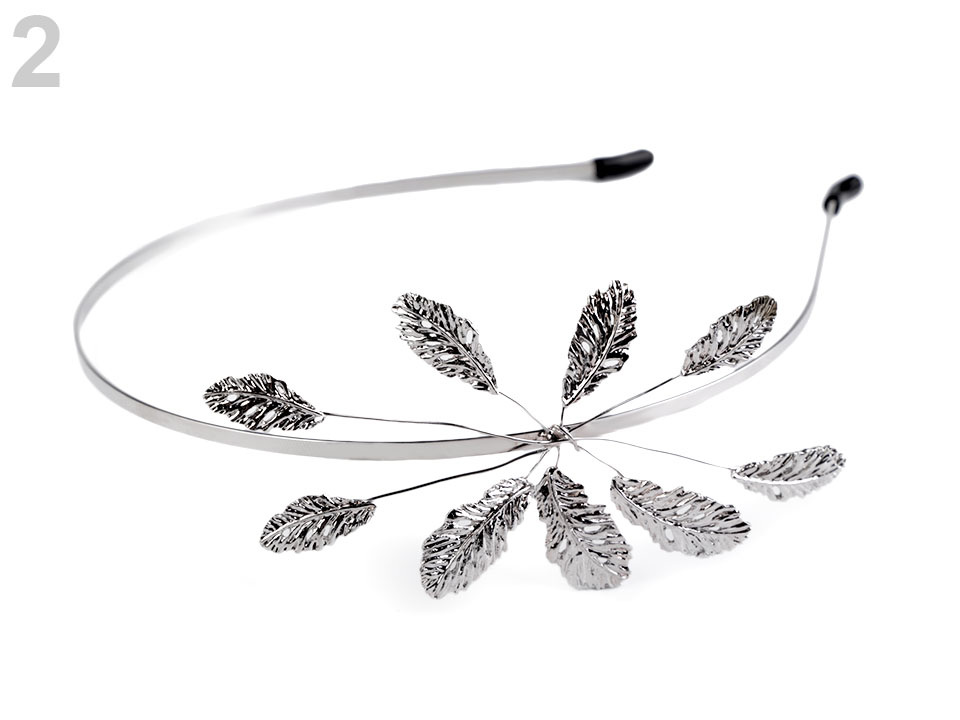 Na tenký kovový základ jsou připevněné ozdobné listy se strukturou žilkování, dají se prostorově tvarovat. Celá ozdoba z listů je dlouhá cca 10 cm. Díky nasazovacím silikonovým koncům čelenka netlačí.