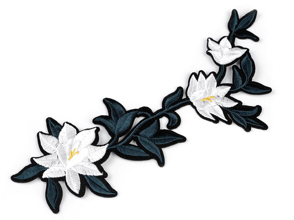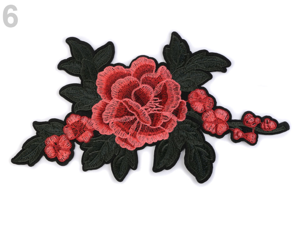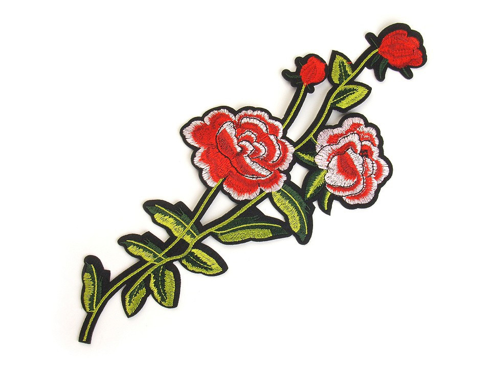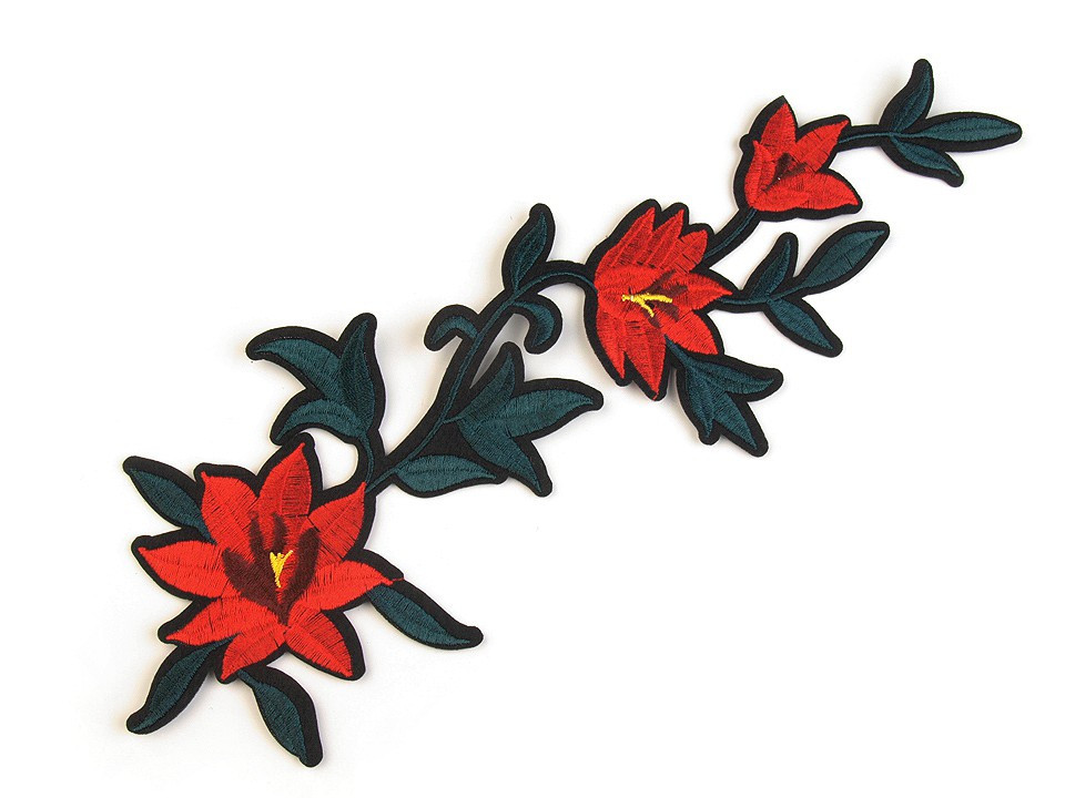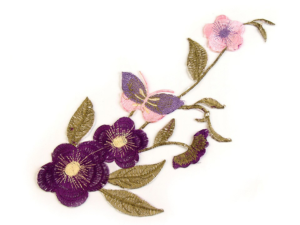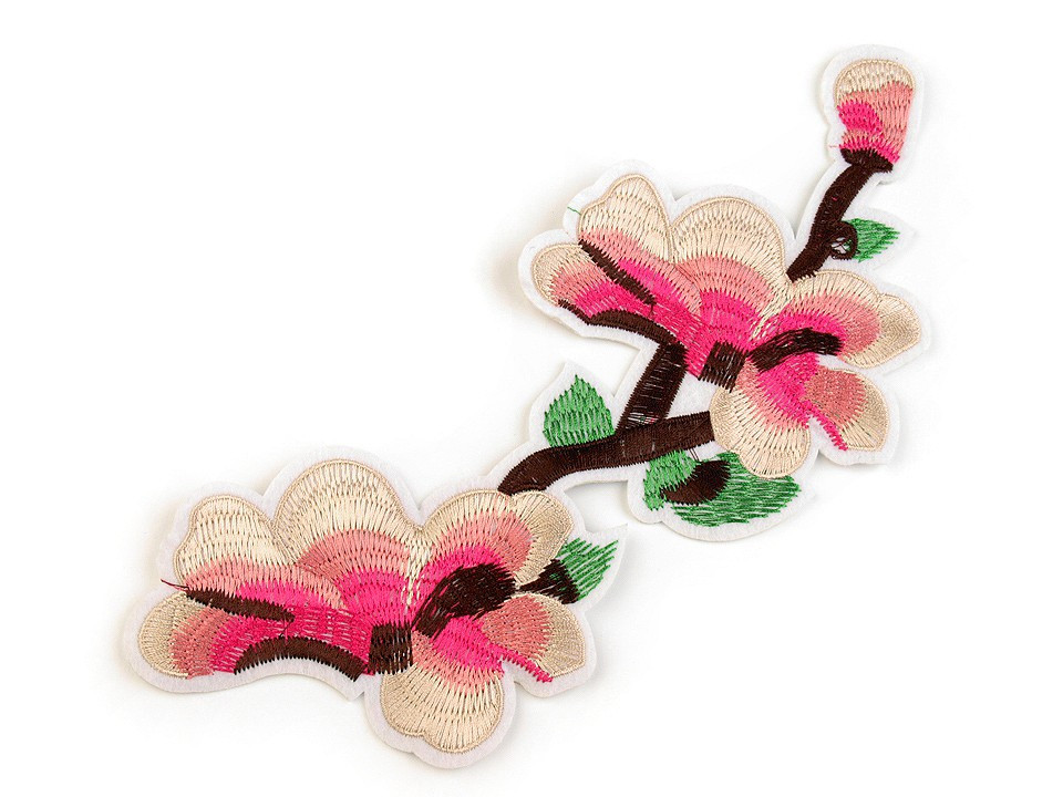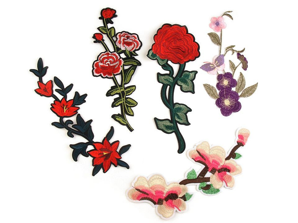 Nažehlovačka s květy má detailní strojovou výšivku.
