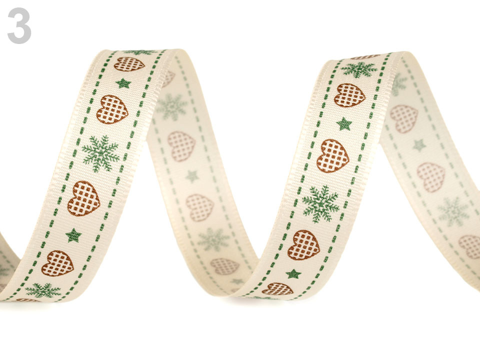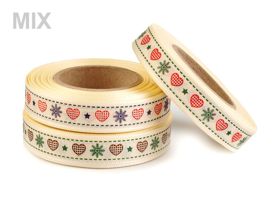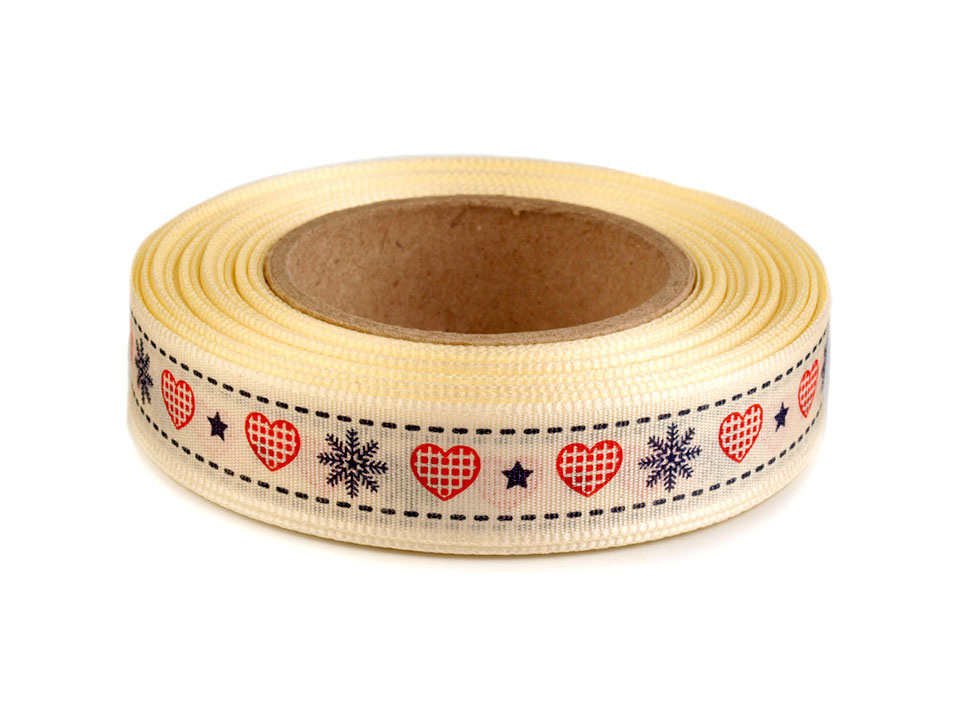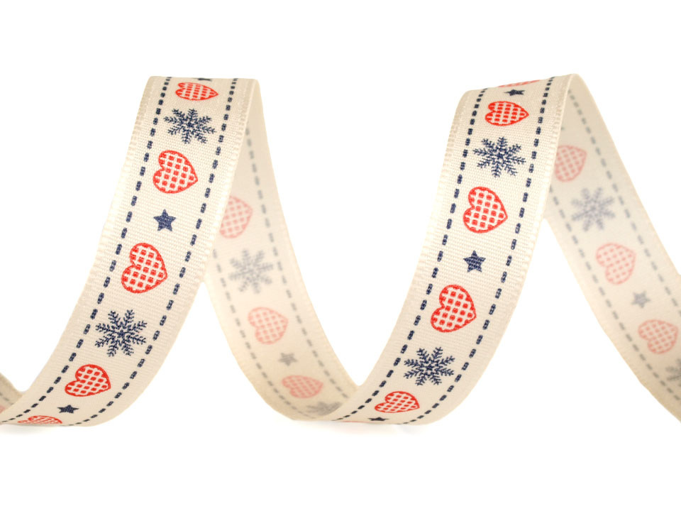 Taftová stuha je zdobena motivem srdíček, vloček a hvězd.