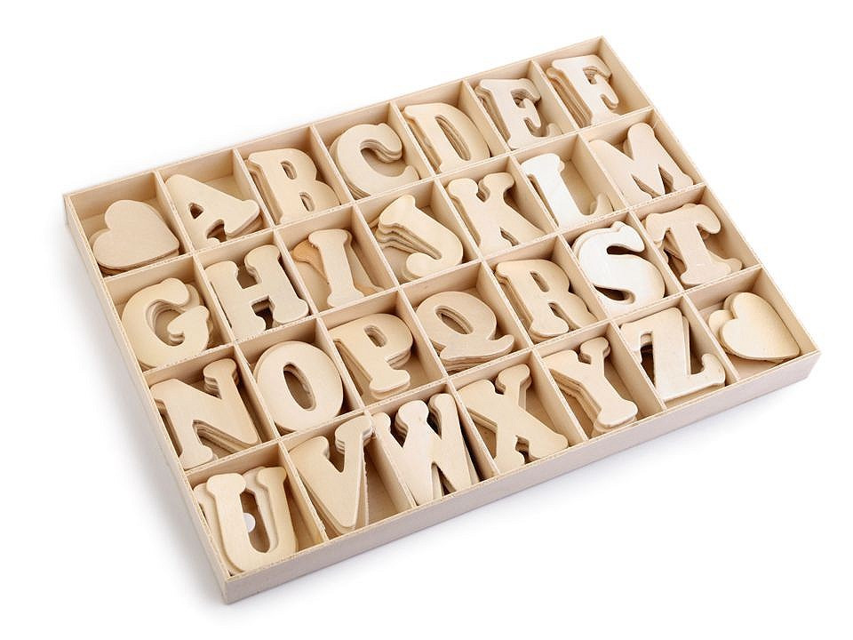 Písmenka jsou uložená v jednotlivých přihrádkách po 4 ks. Celkem je v krabici 104 písmen a 8 srdíček.