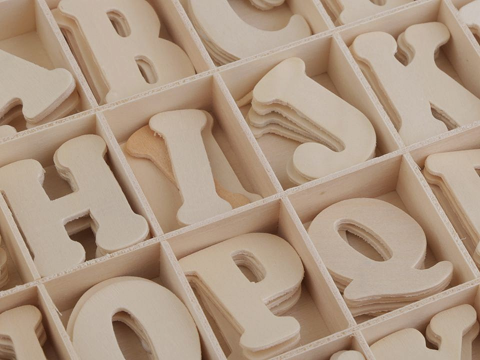 Dřevěná písmena v krabici zobrazují celou abecedu. Můžete s nimi ozdobit dveře dětského pokoje, skříně apod. Z rubu mají lepicí pásku. Abeceda i krabice je vyrobená z překližky.