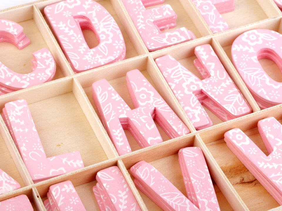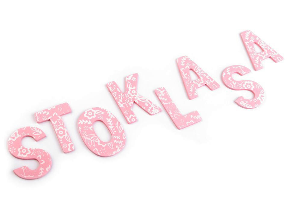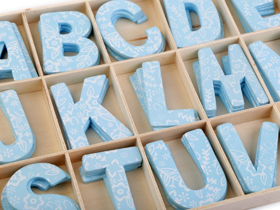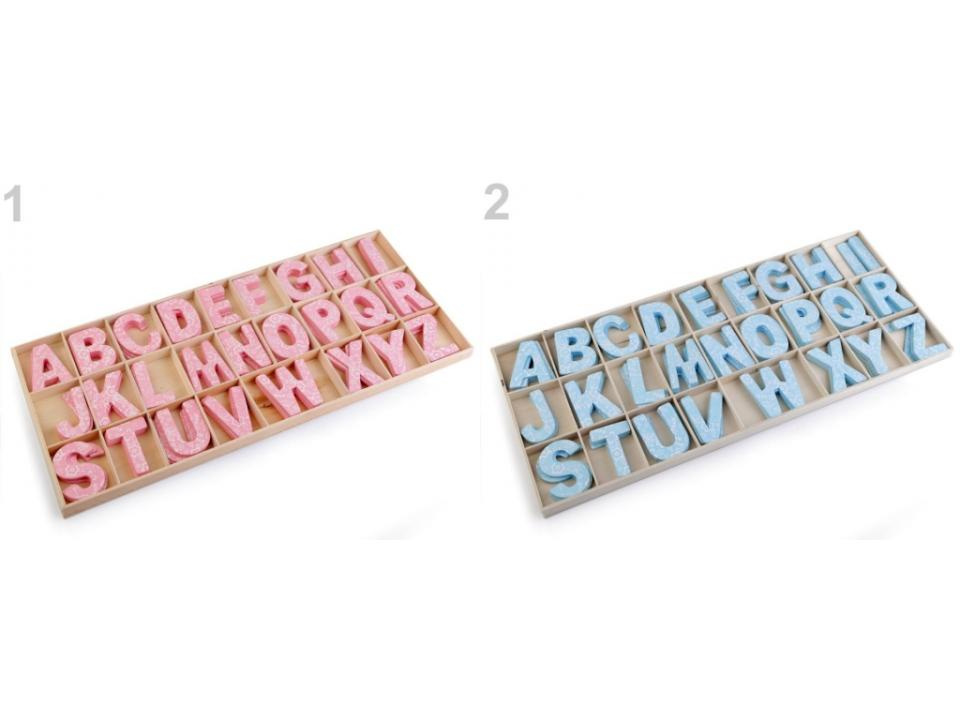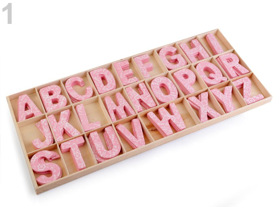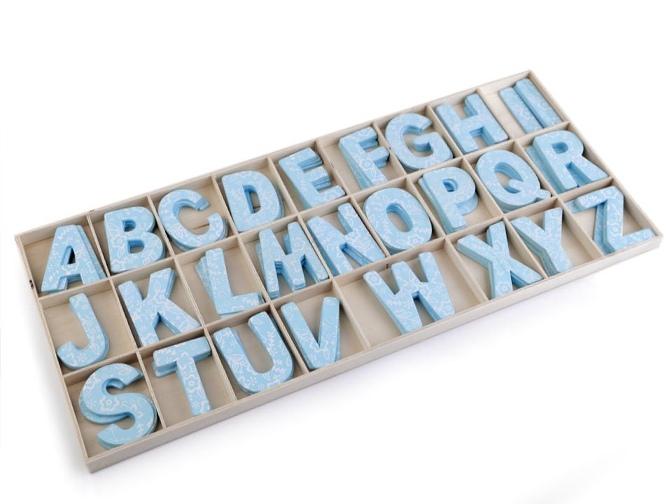 Dřevěná písmena v krabici zobrazují celou abecedu. Můžete s nimi ozdobit dveře dětského pokoje apod. Z rubu nemají samolepku, k přichycení můžete použít oboustrannou lepicí pásku nebo tekuté lepidlo. Písmena mají z jedné strany květinový potisk.