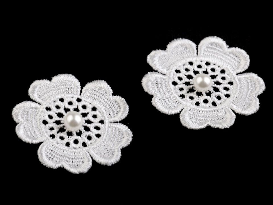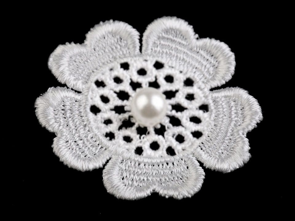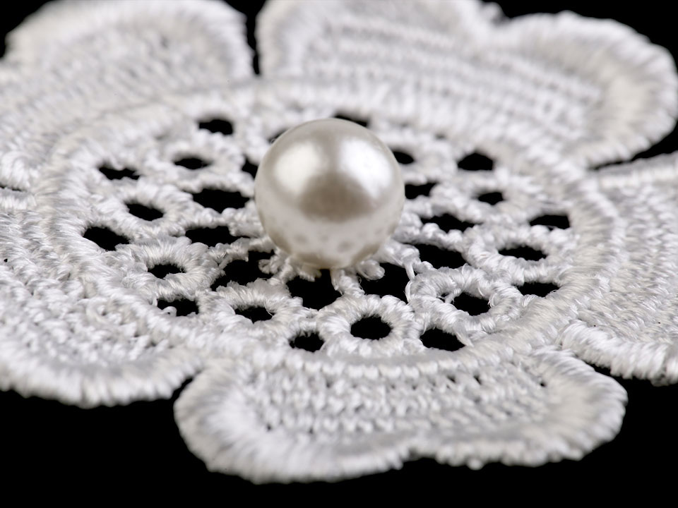 Krajkový květ s korálkem perlového lesku působí velmi romanticky. Má jemnou výšivku, je velice vzdušný.
