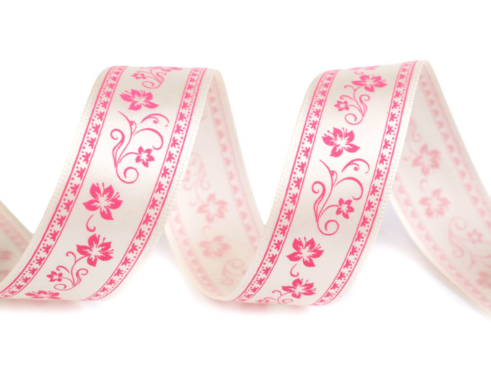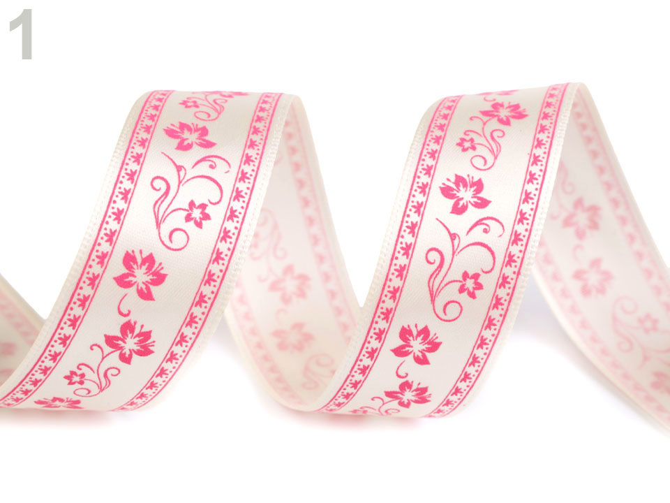 Saténová stuha s potiskem květů je vhodná k dekoračním účelům. Motiv je jednostranný.