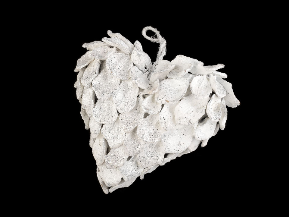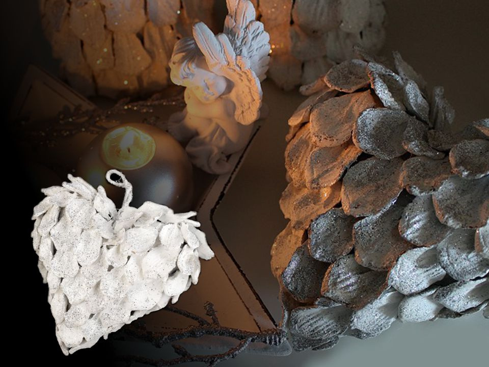 Vánoční stromek či srdce vám v domě doladí sváteční zimní atmosféru. Na polystyrenovém základu jsou nalepeny části šišek. Stříbrné glitry dodávají punc elegance.
